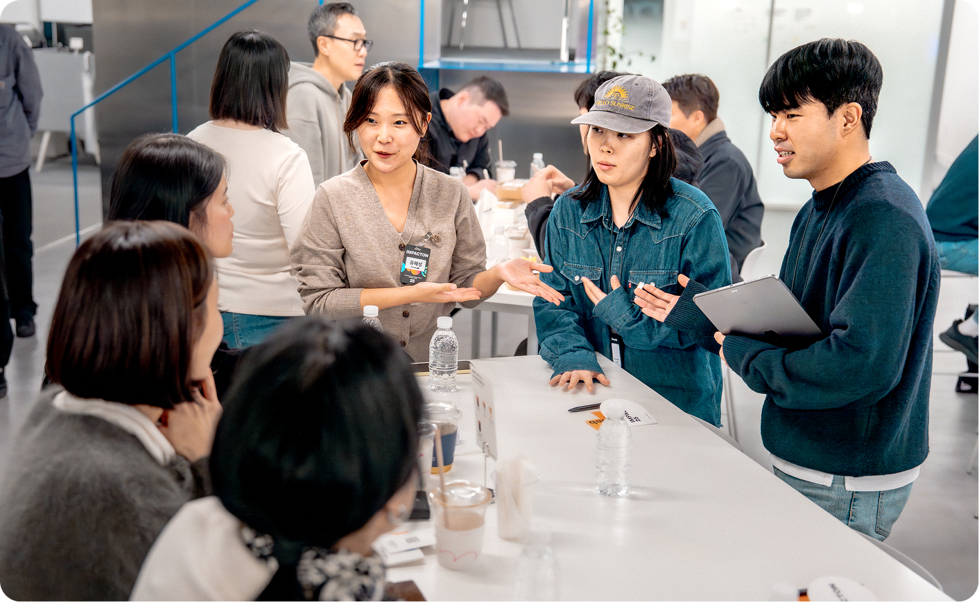 각 테이블에는 아임웹 팀의 세일즈, CX 담당자들이 ‘서포터즈’로 자리해 밋업 전반을 안내하고, 테이블에 모인 참여자분들이 자연스럽게 인사와 이야기를 나눌 수 있도록 도왔습니다. 서포터즈는 이후 네트워킹 시간에 참여자간 네트워킹을 도움은 물론, 참여자분들과 아임웹 팀 구성원들을 연결해 아임웹 활용과 관련된 이야기를 나누실 수 있게 돕는 역할도 담당했습니다.