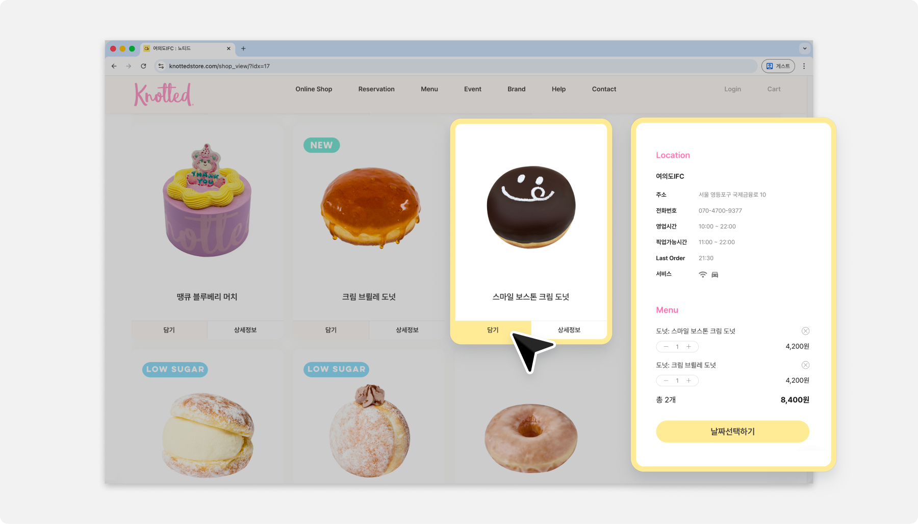 노티드 도넛의 온라인 예약은 단순한 ‘주문서’를 넘어, 매장을 직접 방문하는 순서와 감각을 온라인으로 고스란히 옮겨왔습니다. 매장에 들어서서 진열대를 훑어보고, 도넛을 고르고, 포장을 기다리는 익숙한 과정들을 웹 환경에 맞게 새롭게 정의하기보다, 고객이 이미 알고 있는 친숙한 흐름을 온라인에 최적화하여 구현하는 데 집중했어요.