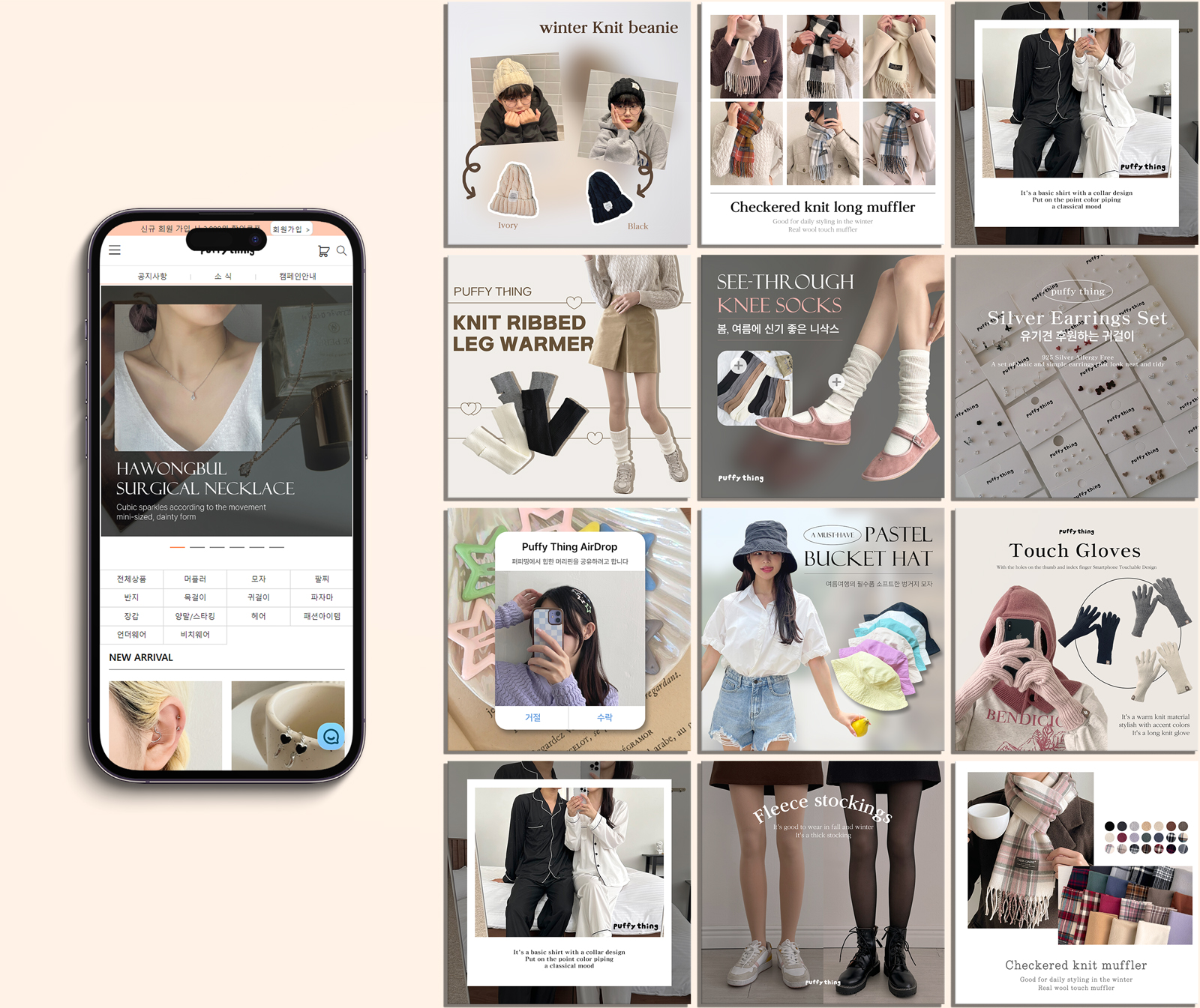 퍼피띵(Puffy Thing)을 위한 인스타그램 카드뉴스 디자인 작업을 소개합니다. 퍼피띵은 여성 의류 및 액세서리 쇼핑몰로, 젊은 여성층을 타겟으로 합니다.