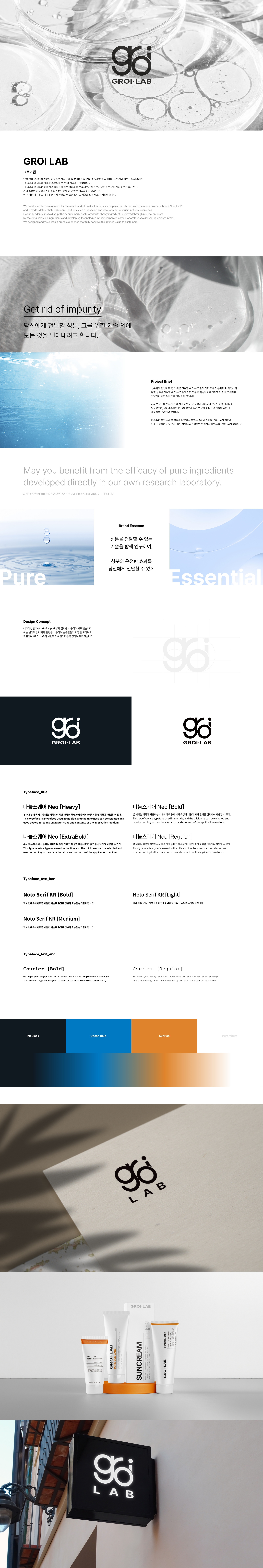 안녕하세요! 아임웹 전문가 로운입니다. 이번 포트폴리오는 Groi Lab의 브랜드 아이덴티티(BI) 디자인 작업입니다. Groi Lab은 화장품 또는 스킨케어 브랜드로 추정되며, 제품의 순수함과 효능을 강조하는 컨셉으로 디자인을 진행했어요.