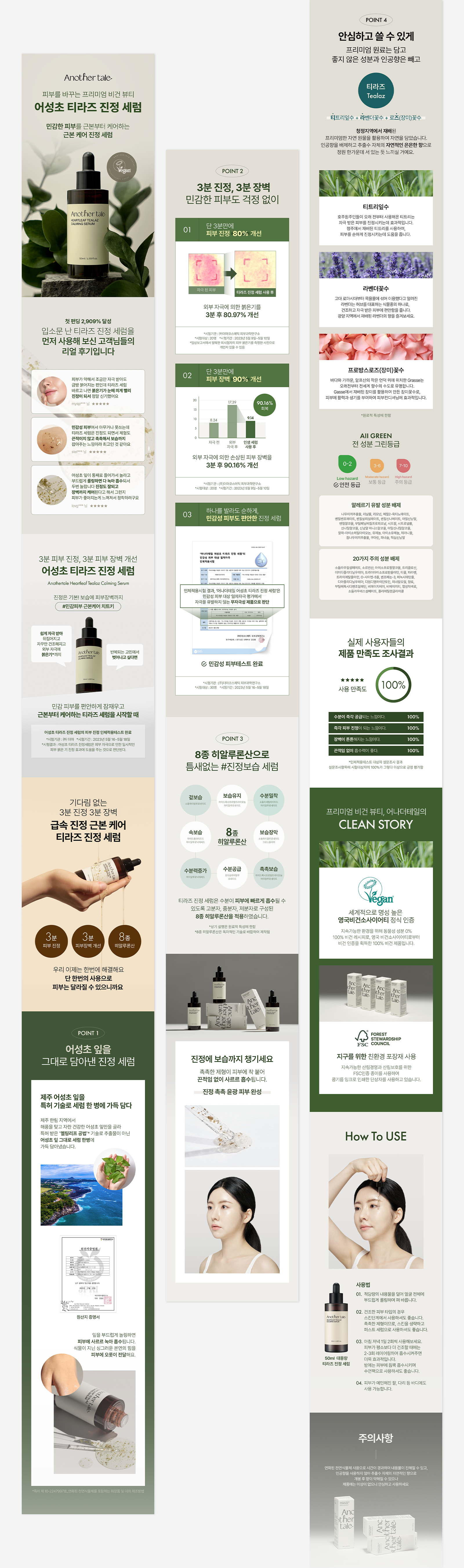 AnotherTale 화장품 세럼 상세페이지는 써니메이크가 아임웹을 이용해 제작했어요. 심플하면서 고급스러운 디자인으로 브랜드 이미지를 잘 나타내고, 제품 특징을 효과적으로 전달하는 데 중점을 두었어요. 고객들이 제품 정보를 쉽고 빠르게 이해할 수 있도록 직관적인 구성과 디자인을 적용했고요. 특히, 제품의 주요 성분과 효능을 시각적으로 잘 보여주는 고품질 이미지와 깔끔한 레이아웃으로 신뢰감을 높였어요.