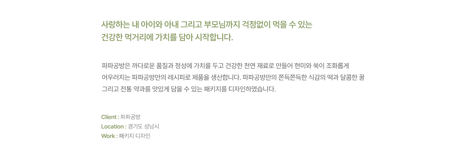 안녕하세요! 아임웹 전문가 투커입니다. 이번에 소개해 드릴 포트폴리오는 파파공방의 패키지 디자인이에요. 파파공방은 자연친화적인 재료를 사용하여 전통적인 방식으로 떡을 만드는 곳인데요, 이런 브랜드의 아이덴티티를 잘 보여주는 디자인을 목표로 했어요.