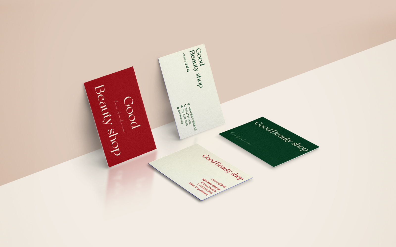 심플하면서도 세련된 워드마크 로고와 3가지 색상(빨강, 베이지, 초록)의 명함 디자인으로 다양한 뷰티샵 브랜드 이미지에 맞춰 제작이 가능합니다. 빨간색 명함은 강렬하고 활기찬 이미지를, 베이지색 명함은 부드럽고 고급스러운 이미지를, 초록색 명함은 자연 친화적이고 편안한 이미지를 연출해요. 고객님의 브랜드 컨셉에 가장 잘 어울리는 색상을 선택하실 수 있도록 다양한 옵션을 제공하고 있습니다.
