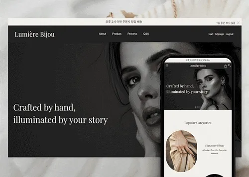 벨레차 주얼리 컬렉션 웹사이트는 심플하고 고급스러운 디자인을 통해 브랜드의 아이덴티티를 효과적으로 보여주는 것을 목표로 제작되었습니다. 주얼리 특유의 고급스러움과 세련됨을 강조하면서, 고객들이 제품을 쉽게 탐색하고 구매할 수 있도록 직관적인 인터페이스를 제공합니다. 특히, 모바일 환경에서도 최적의 사용자 경험(UX)을 제공하기 위해 반응형 웹 디자인을 적용했어요. 메인 화면에는 벨레차의 새로운 컬렉션을 강조하여 고객들의 시선을 사로잡고, 'GO' 버튼을 통해 직접적으로 상품 페이지로 이동할 수 있도록 편의성을 높였습니다. 'About Us', 'Shop', 'Lookbook', 'Community' 메뉴를 통해 브랜드 소개, 상품 구매, 룩북 확인, 커뮤니티 참여 등 다양한 기능을 손쉽게 이용할 수 있어요. 아임웹의 SEO(검색엔진최적화) 기능을 활용하여 검색엔진에서의 노출을 최대화하고, 잠재 고객들에게 더욱 효과적으로 다가갈 수 있도록 했습니다. 고급스러운 주얼리를 판매하는 쇼핑몰, 감각적인 디자인과 사용자 편의성을 중시하는 젊은 여성층 고객을 타겟으로 제작되었어요. 아임웹의 편리한 기능을 사용하여 디자인 제작 기간을 단축하고 비용을 절감하여 효율적인 웹사이트 제작이 가능했어요.