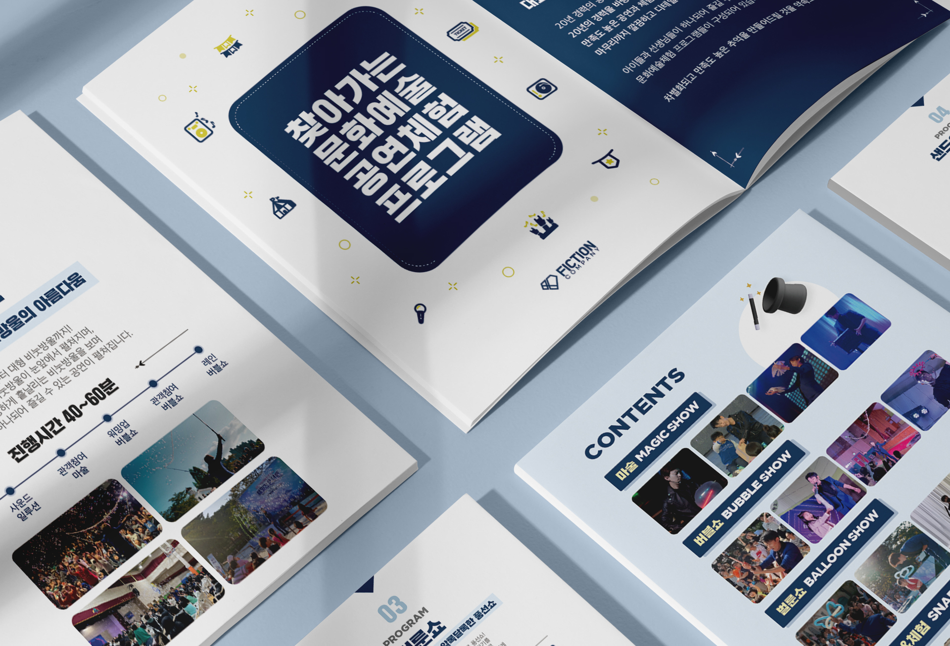 컨셉은 ‘공연의 매력을 시각적으로 전달하는 고급스러운 카탈로그’예요. 픽션컴퍼니의 다양한 공연 프로그램(매직쇼, 버블쇼, 풍선쇼 등)을 세련된 이미지와 간결한 설명을 통해 효과적으로 보여주고자 했어요. 고객에게 프로그램의 특징과 분위기를 직관적으로 이해시키는 데 중점을 두었죠. 타겟 고객은 공연 예약 담당자, 기업 행사 기획자, 그리고 각종 이벤트 및 축제를 기획하는 분들이에요. 이들에게 픽션컴퍼니의 전문성과 다양한 공연 프로그램을 효과적으로 어필하고, 믿음직한 파트너로서 인식될 수 있도록 디자인 했어요.