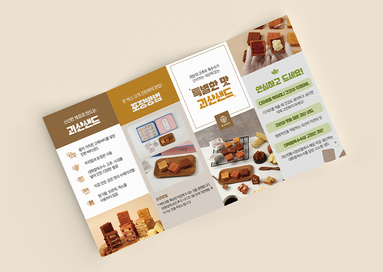컨셉은 '고급스럽고 맛깔스러운 괴산샌드'를 표현하는 것이었어요. 타겟 고객은 괴산샌드를 처음 접하는 고객 또는 선물용으로 괴산샌드를 고려하는 고객이에요. 고객들이 괴산샌드의 맛과 품질을 직관적으로 이해하고 구매 욕구를 높일 수 있도록 제품 사진과 상세 설명을 효과적으로 배치했어요. 특히, 브로슈어의 종이 질감과 색상 선택에도 심혈을 기울여 괴산샌드의 고급스러운 이미지를 더욱 부각시켰습니다.