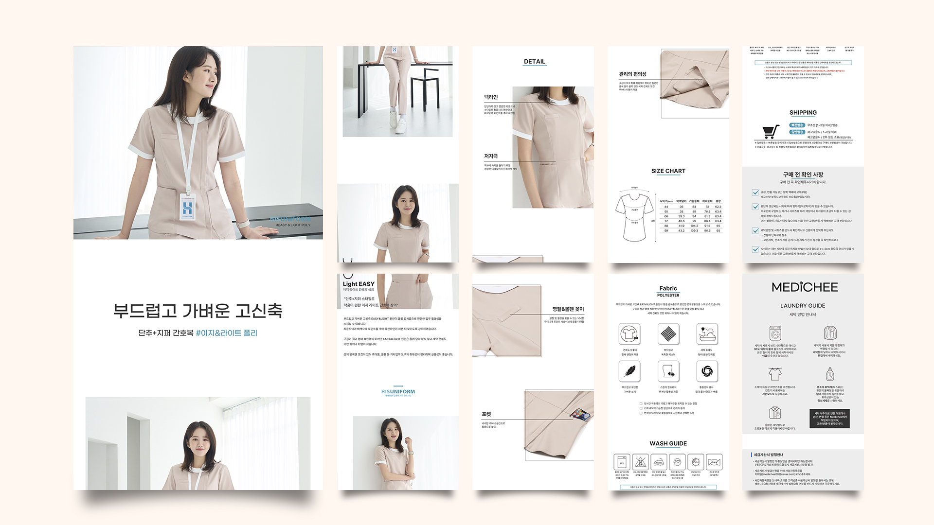 메디컬 의류 특유의 전문성과 신뢰성을 강조하기 위해, 톤앤매너는 밝고 깨끗한 분위기로 유지하면서 세련된 디자인 요소를 가미했어요. 제품의 디테일을 보여주는 고화질 이미지와 함께, 사이즈 정보, 세탁 방법 등 필요한 정보들을 명확하고 간결하게 정리하여 고객의 구매 결정에 도움을 드리도록 구성했어요. 모바일 환경에서도 최적의 사용자 경험(UX)을 제공하기 위해 반응형 웹 디자인을 적용했고요.