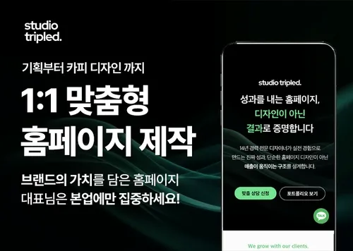 디자인 방향은 블랙을 메인컬러로 설정하여 고급스럽고 강렬한 브랜드 아이덴티티를 표현했다. 블랙 배경은 광고대행사 특유의 전문적 이미지를 강화하는 데 적합하며, 이를 보완하기 위해 역동적인 블루 파티클 애니메이션을 활용해 현대적이고 혁신적인 분위기를 구현했다. 메인 비주얼에는 네이버와 카카오 로고를 직관적으로 배치해 공식 대행사임을 명확하게 강조하고, 방문자가 브랜드 신뢰도를 빠르게 인지할 수 있도록 구성했다. 전체적으로 세련된 톤앤매너를 유지하여 시각적 임팩트와 브랜드 일관성을 강화했다.