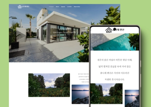 컨셉은 '모던함과 자연미의 조화'입니다. 심플하면서도 세련된 디자인으로 펜션의 고급스러운 이미지를 강조하고, 푸른 자연과 조화를 이루도록 밝고 산뜻한 색감을 사용했어요. 고객들이 펜션의 정보를 쉽고 빠르게 찾아볼 수 있도록 직관적인 메뉴 구성과 사용하기 편리한 인터페이스를 구현했어요. 특히, 펜션의 사진들을 고화질로 제공하여 시각적인 만족도를 높였습니다.