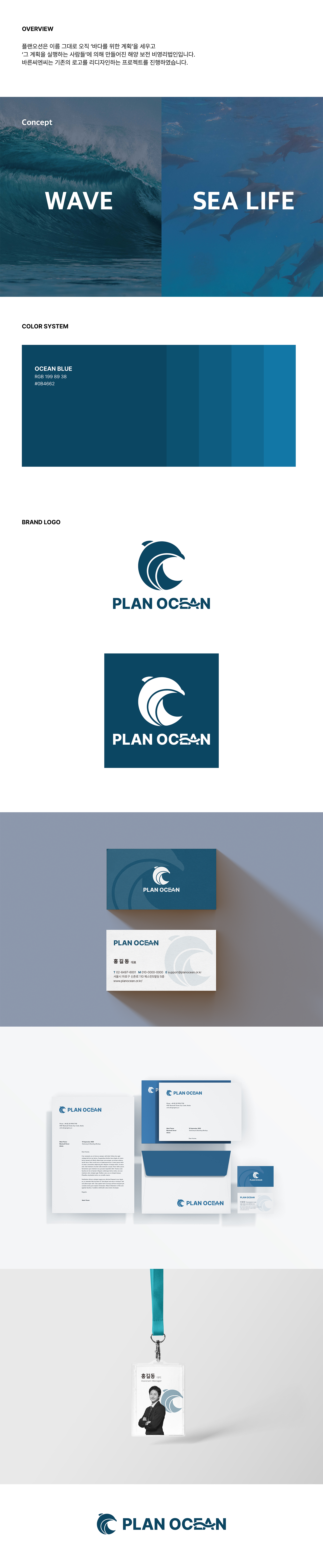 새로운 로고 디자인은 명함, 편지봉투 등 다양한 인쇄물에 적용되어 브랜드 일관성을 유지하도록 했어요. 색상 시스템은 바다를 연상시키는 블루 계열을 사용하여 플랜오션의 청량하고 신뢰감 있는 이미지를 강조했고요. 전체적으로 심플하면서도 전문적인 느낌을 주는 디자인을 완성하여, 플랜오션이 목표하는 고객에게 명확하고 효과적으로 브랜드 메시지를 전달할 수 있도록 했답니다.