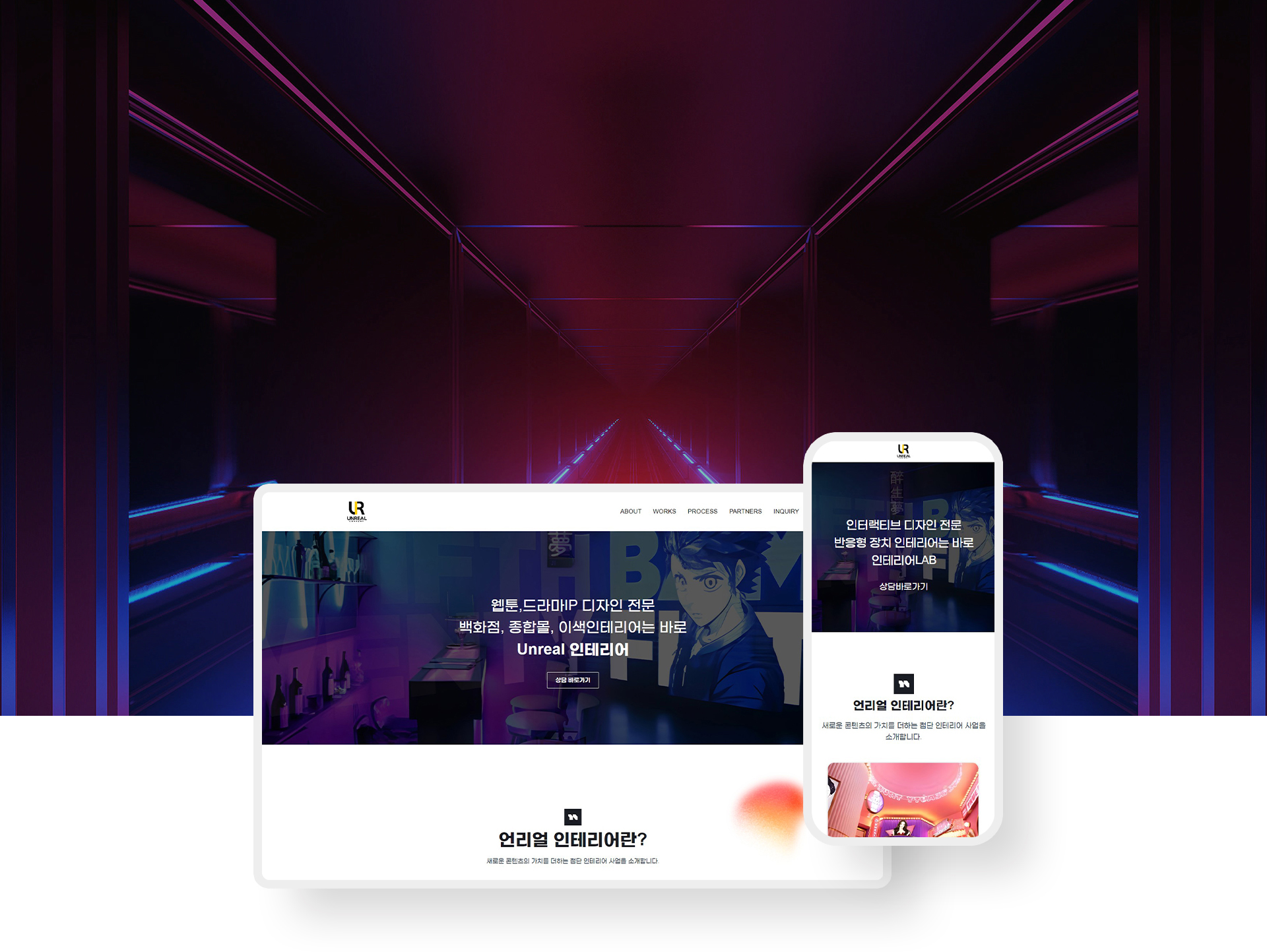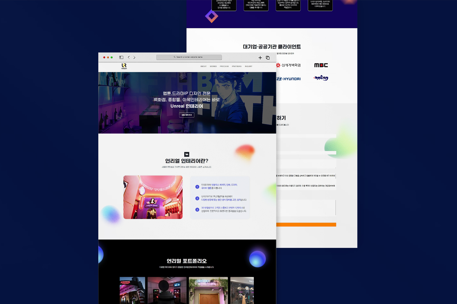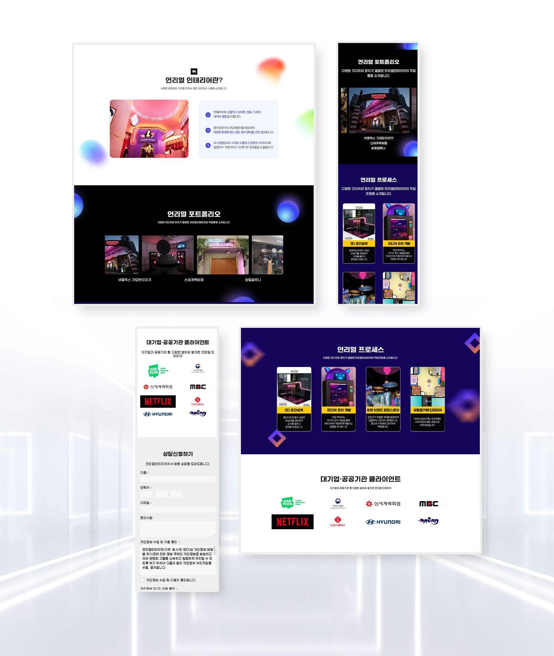 루다랩은 특수 인테리어 사업을 위한 랜딩페이지를 아임웹을 통해 제작했어요. 고객의 사업 특징을 효과적으로 보여주는 것이 중요하다고 판단하여, Unreal Engine(언리얼 엔진)을 활용한 고품질 3D 이미지와 영상을 통해 현실감 넘치는 인테리어를 보여주는 데 중점을 두었어요.