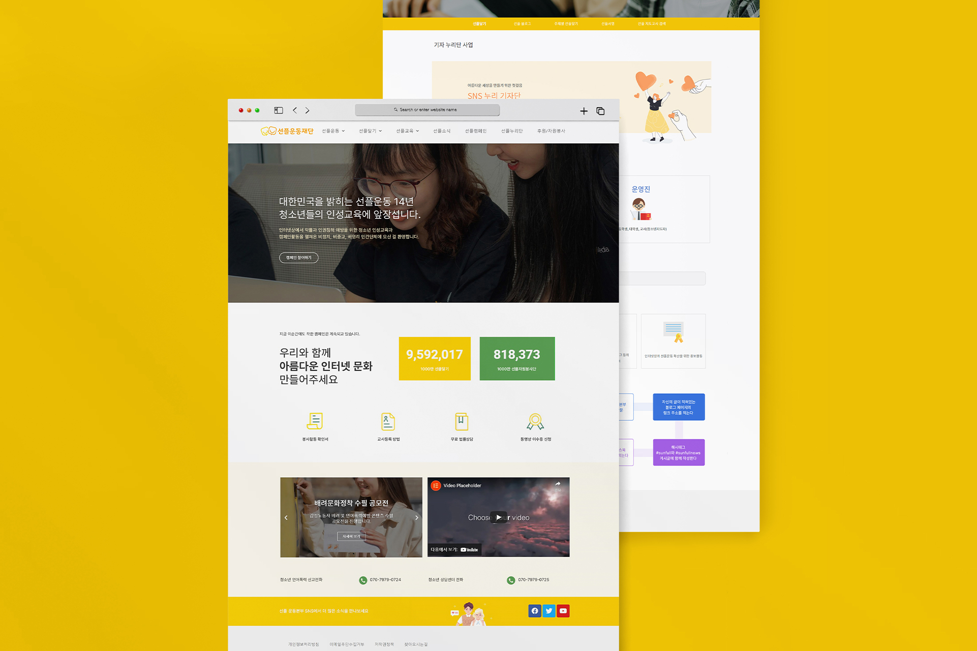 컨셉은 '따뜻하고 신뢰감 있는 이미지'입니다. 선플운동재단의 활동 내용을 명확하게 보여주면서, 사용자들이 쉽게 정보를 얻고 참여할 수 있도록 디자인에 중점을 두었어요. 밝고 긍정적인 색상과 일러스트를 사용하여, 선플운동의 긍정적인 메시지를 시각적으로 전달하고자 했습니다.