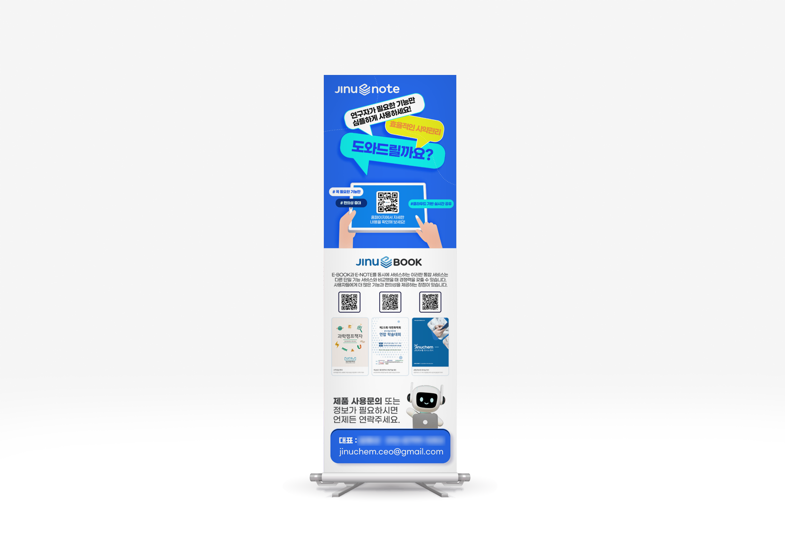 주식회사 지누켐의 브랜드 이미지와 제품 특징을 고려하여, 시각적으로 매력적이고 정보 전달이 명확한 배너를 제작했습니다. 특히, QR코드를 활용하여 온라인으로의 접근성을 높였고, 제품 카탈로그, 자료 등 추가 정보를 손쉽게 얻을 수 있도록 했어요.