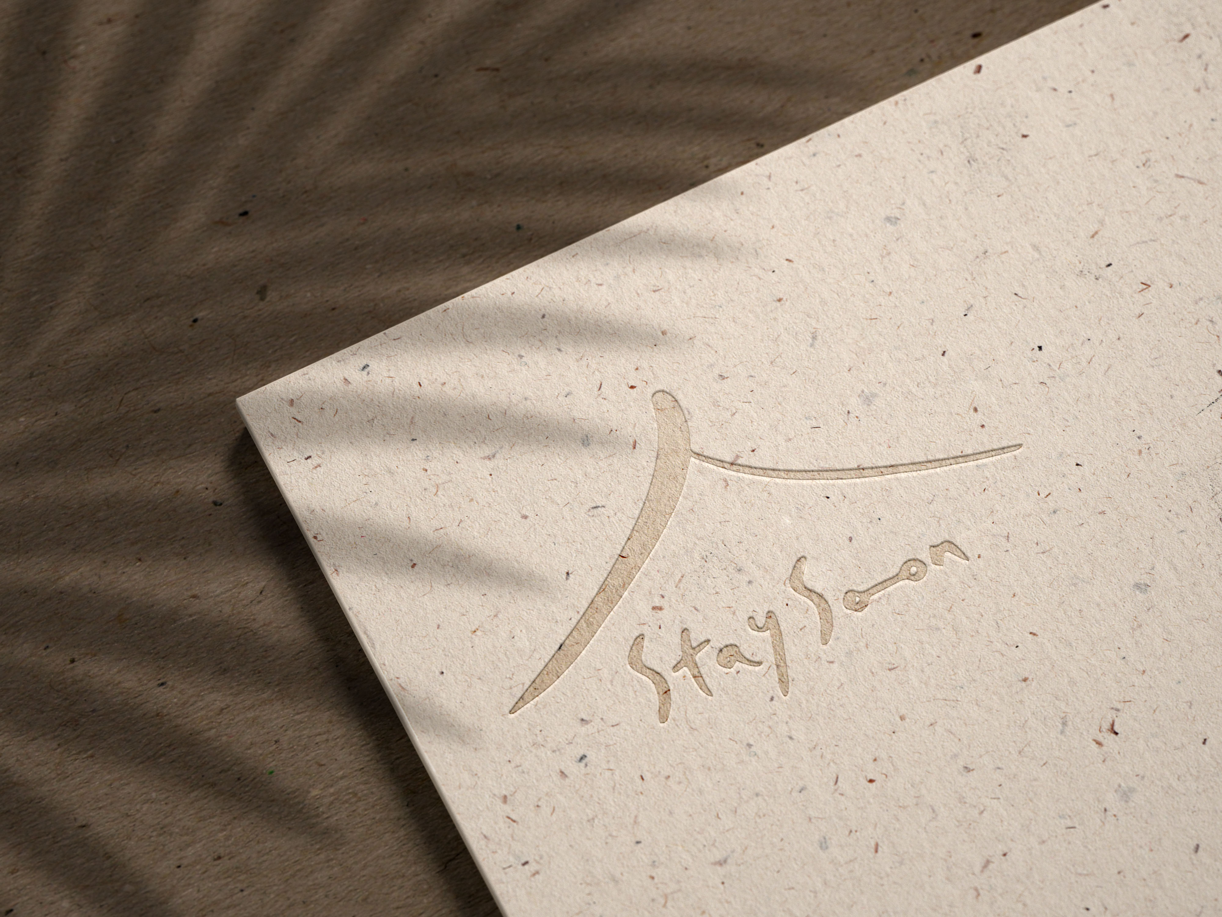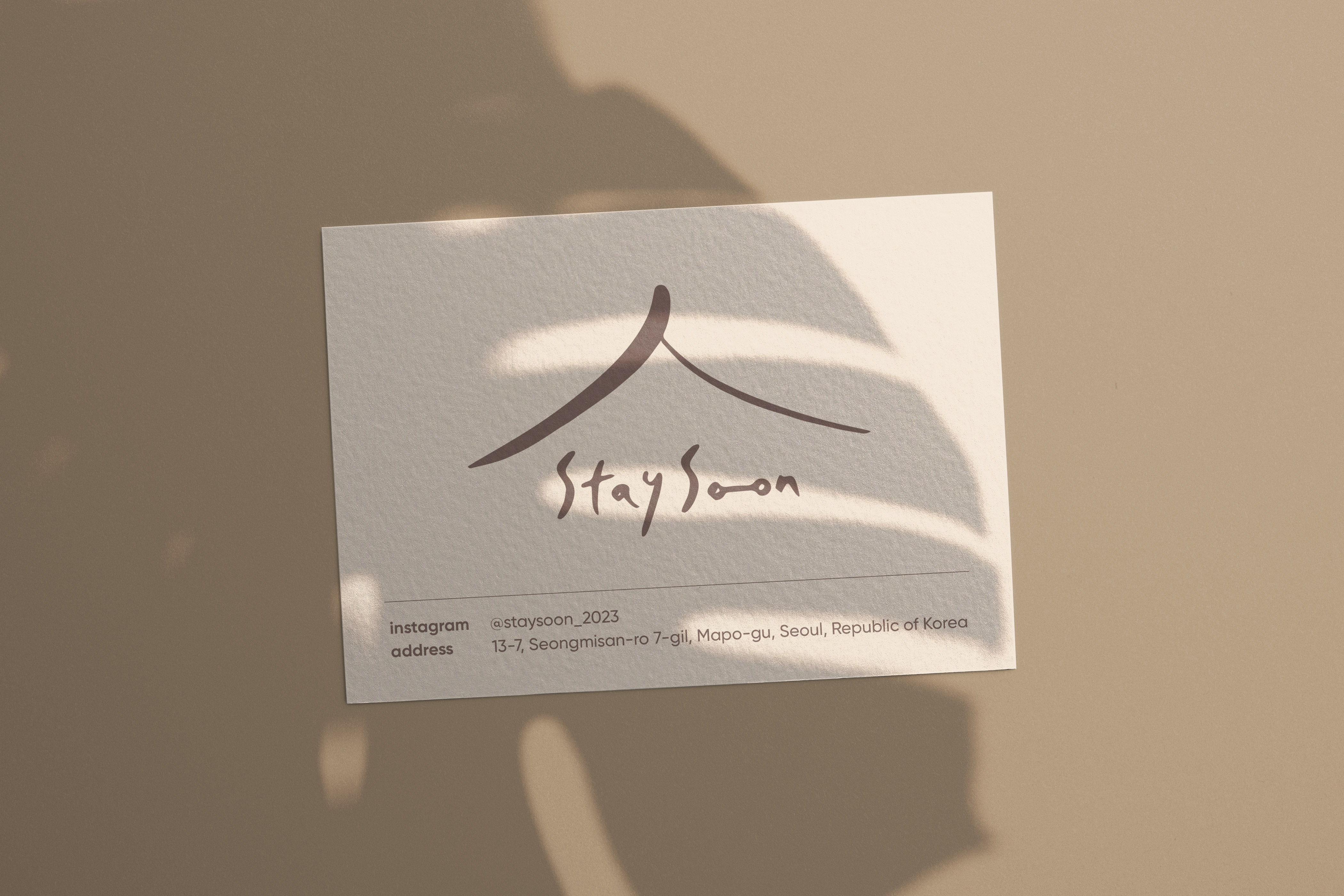 'Stay Soon'은 편안하고 아늑한 분위기를 표현하는 것이 중요했어요. 그래서 캘리그라피 스타일의 부드러운 글씨체와 집 모양을 연상시키는 심플한 형태를 사용하여 편안함과 아늑함을 시각적으로 나타내고자 했습니다.