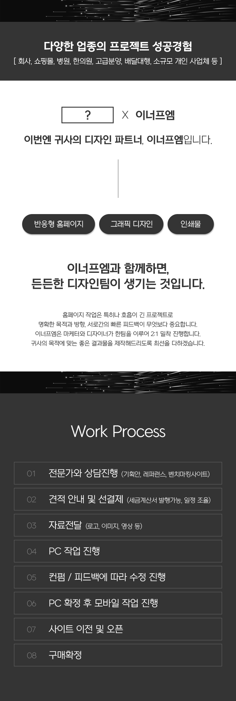이너프엠은 다양한 업종의 프로젝트를 성공적으로 수행해 온 경험을 바탕으로, 고객에게 최적의 웹사이트를 제공하는 아임웹 전문가입니다.