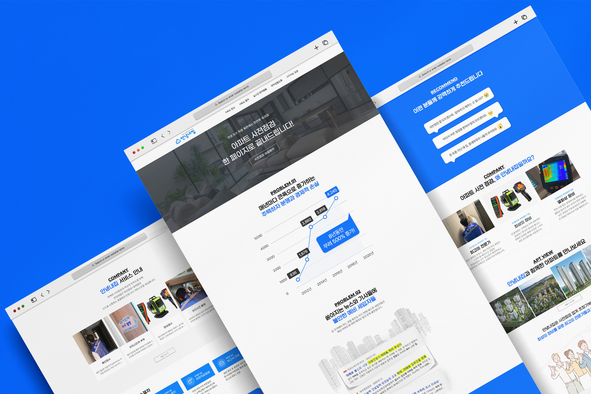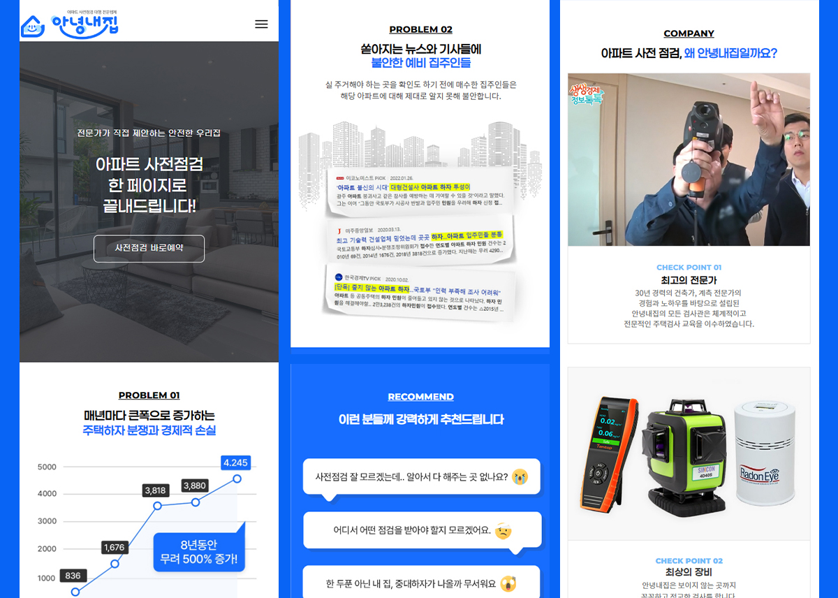 안녕내집 아파트 사전점검 랜딩페이지는 사용자에게 직관적이고 매력적인 경험을 제공하는 것을 목표로 제작되었어요. 아파트 사전점검 서비스에 대한 이해도가 높지 않은 고객도 쉽게 서비스 내용을 파악하고 신뢰할 수 있도록 디자인과 정보 구성에 신경썼습니다.