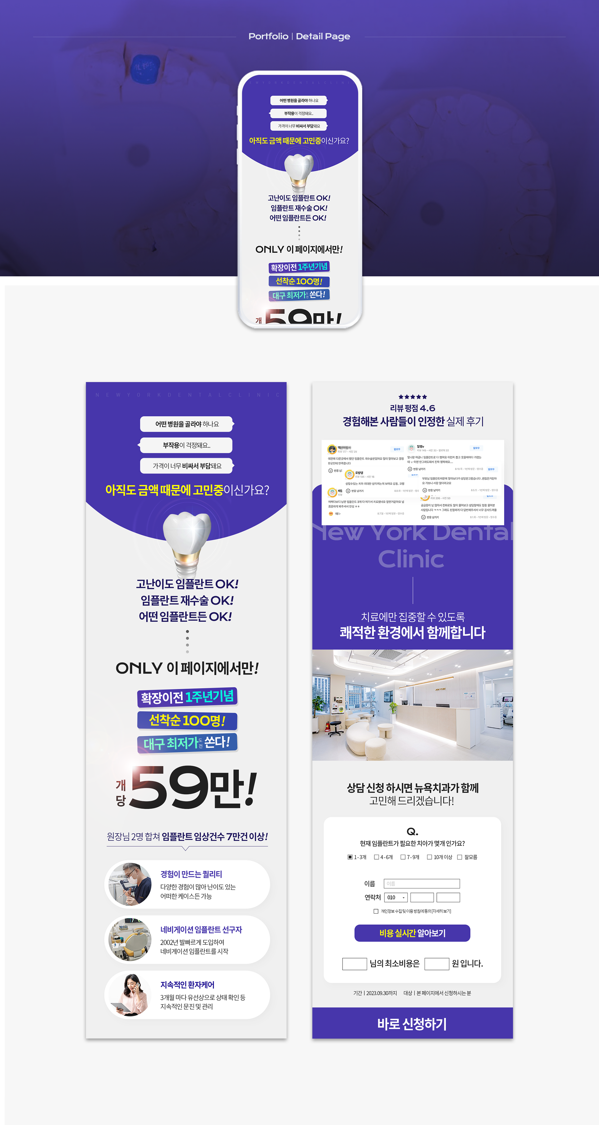 뉴욕치과의 임플란트 이벤트를 위한 랜딩페이지를 제작했어요. 59만원 이벤트라는 강력한 메시지를 전달하고, 고객의 이목을 사로잡는 디자인으로 전환율을 높이는 데 집중했답니다.