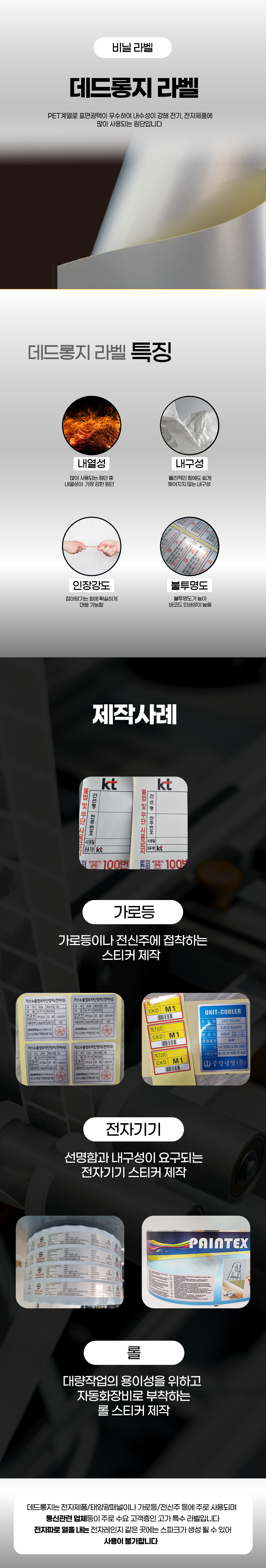 SI label은 데드롱 스티커 라벨의 상세페이지를 제작하면서, 제품의 특징과 장점을 효과적으로 보여주는 데 중점을 두었습니다. 다양한 종류의 데드롱 스티커 라벨을 시각적으로 매력적으로 보여주기 위해 고품질의 이미지와 깔끔한 레이아웃을 사용했어요. 특히, 제품의 소재와 특징을 명확하게 설명하고, 다양한 용도에 맞는 활용 사례를 보여주어 고객의 이해도를 높였습니다.