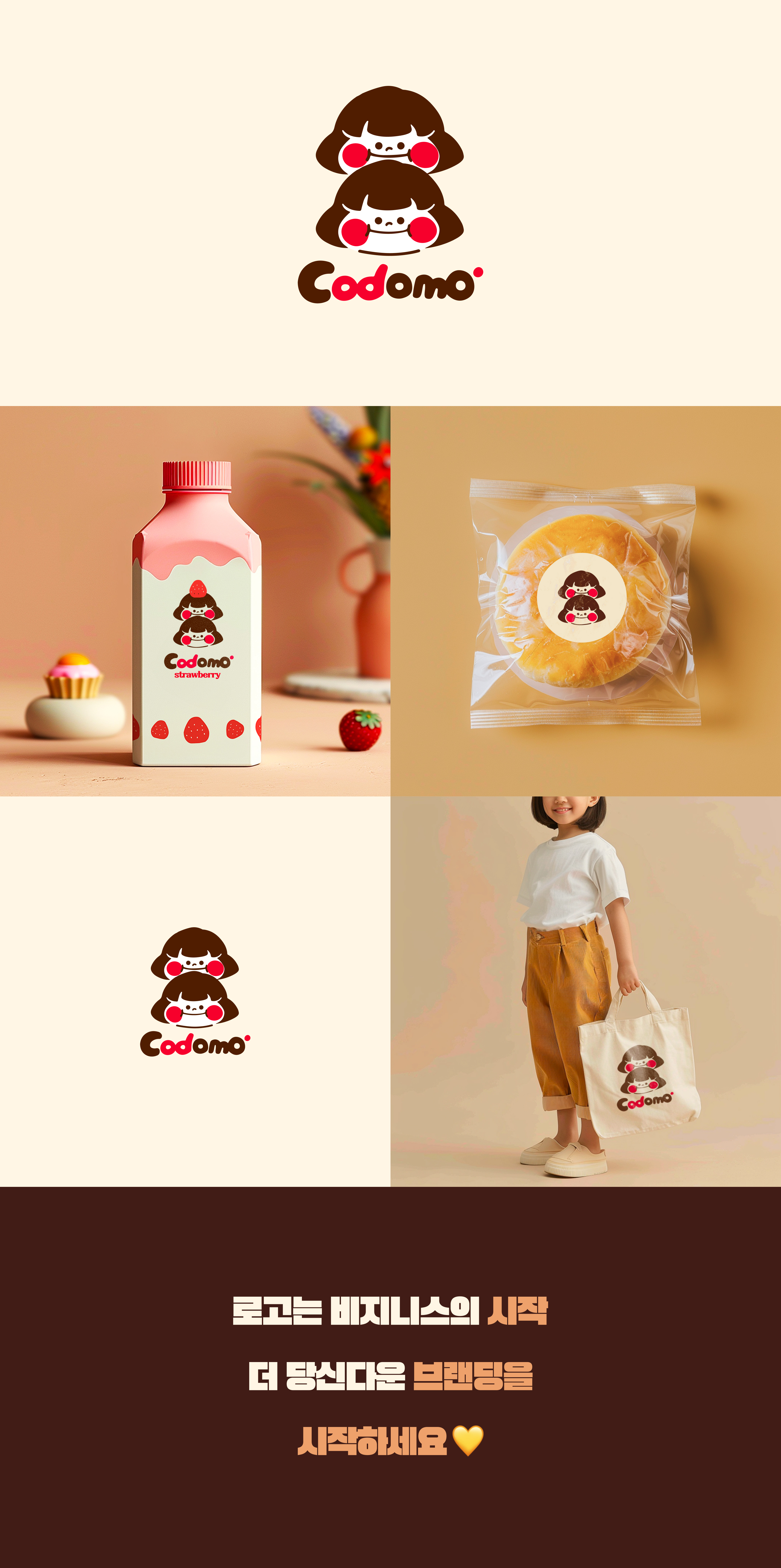 안녕하세요! 아임웹 전문가 mooi입니다. 이번 포트폴리오는 'Codomo'라는 이름의 일본 감성 캐릭터 브랜딩 디자인 작업이에요. 귀엽고 사랑스러운 캐릭터를 활용하여 브랜드의 아이덴티티를 구축하고, 다양한 디자인 요소에 일관된 디자인 스타일을 적용하여 통일성을 확보했어요.