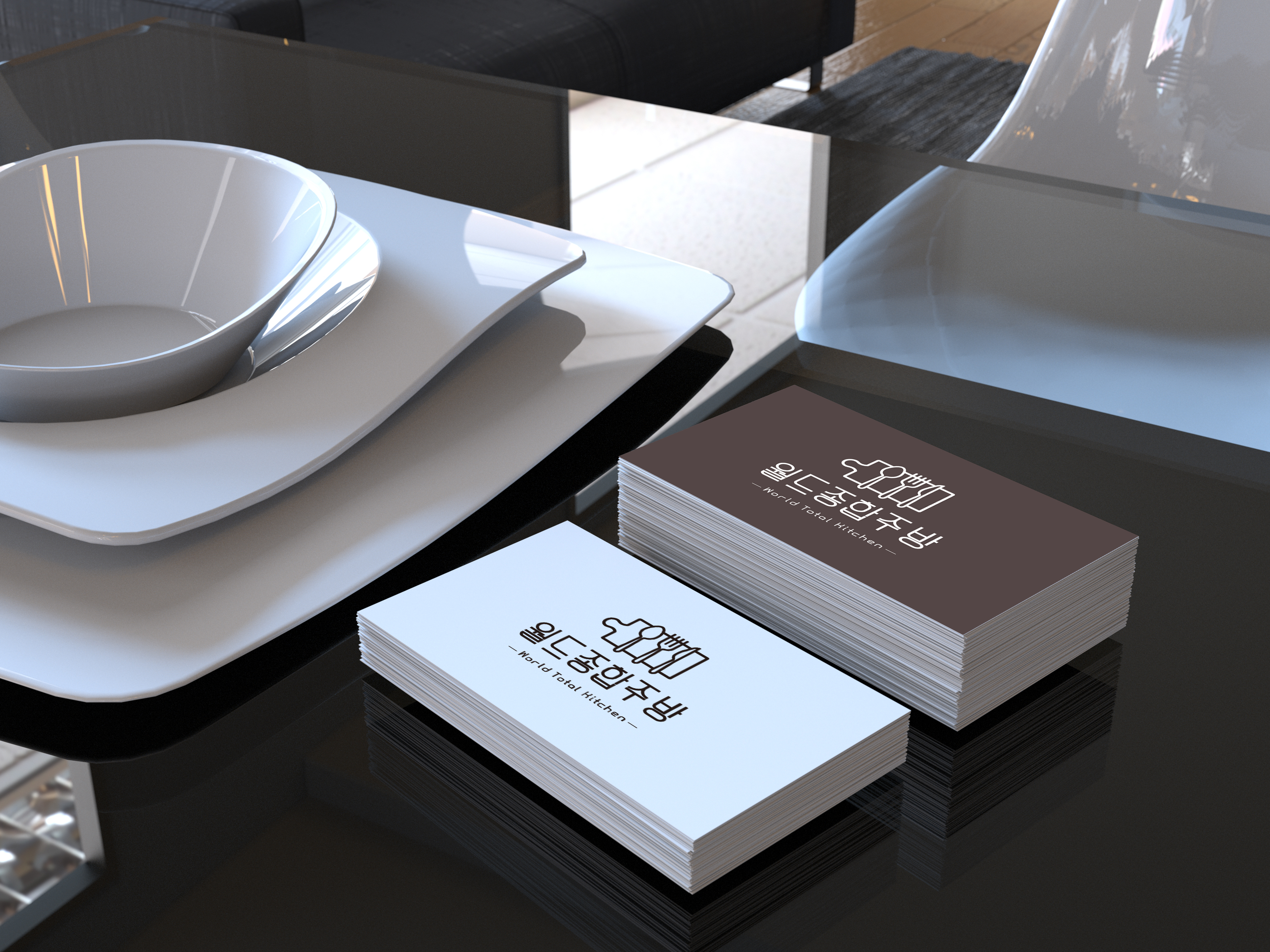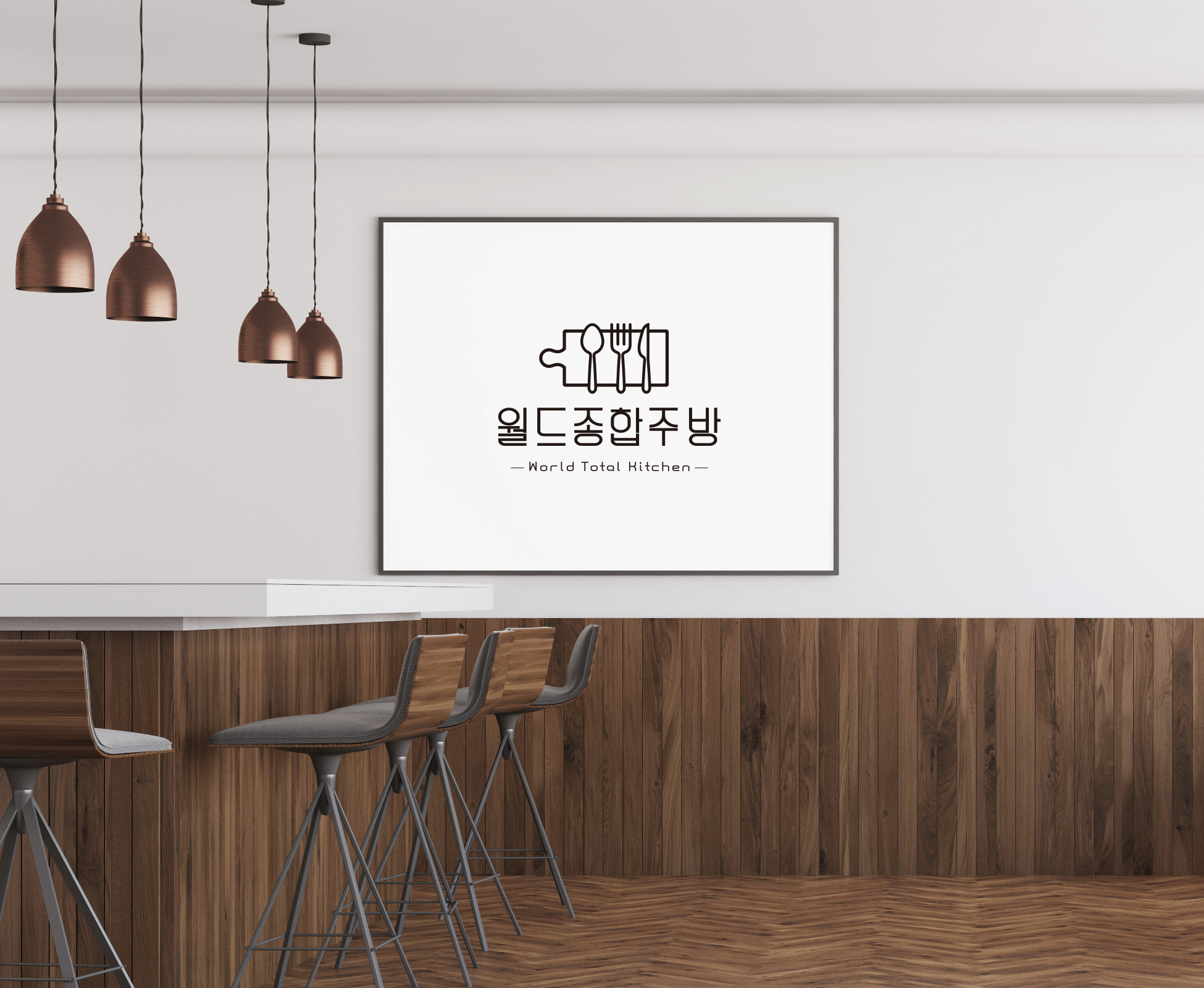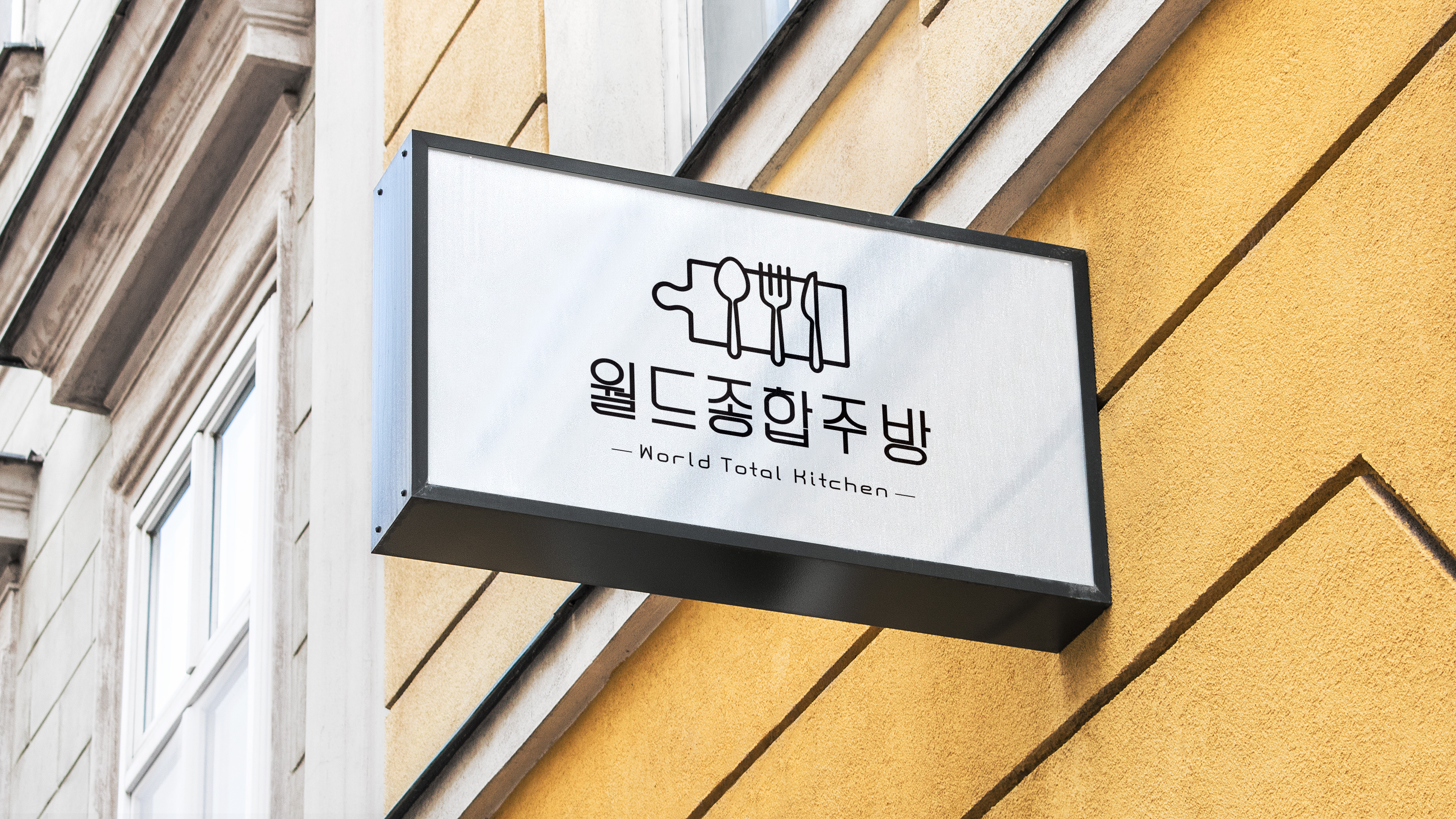컨셉은 '세련되고 전문적인, 그리고 기억에 남는 브랜드 이미지 구축'이었어요. 월드종합주방이라는 이름에서 느껴지는 글로벌하고 다양한 메뉴를 포괄하는 이미지를 효과적으로 전달하기 위해 심플하면서도 고급스러운 디자인을 추구했답니다.