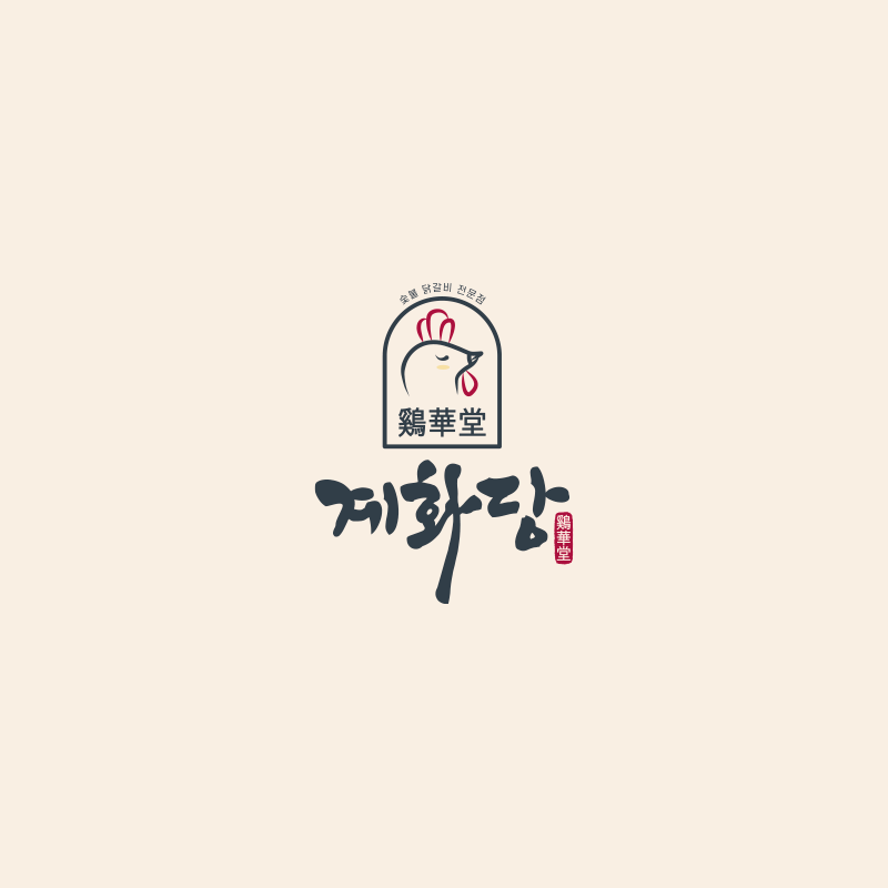 계화당의 브랜딩 컨셉은 '정통 숯불닭갈비의 맛과 현대적인 감각의 조화'입니다. 젊은 세대에게 어필하면서도 숯불닭갈비의 전통적인 맛을 잊지 않도록, 캘리그라피와 귀여운 캐릭터를 활용한 로고를 디자인했어요.