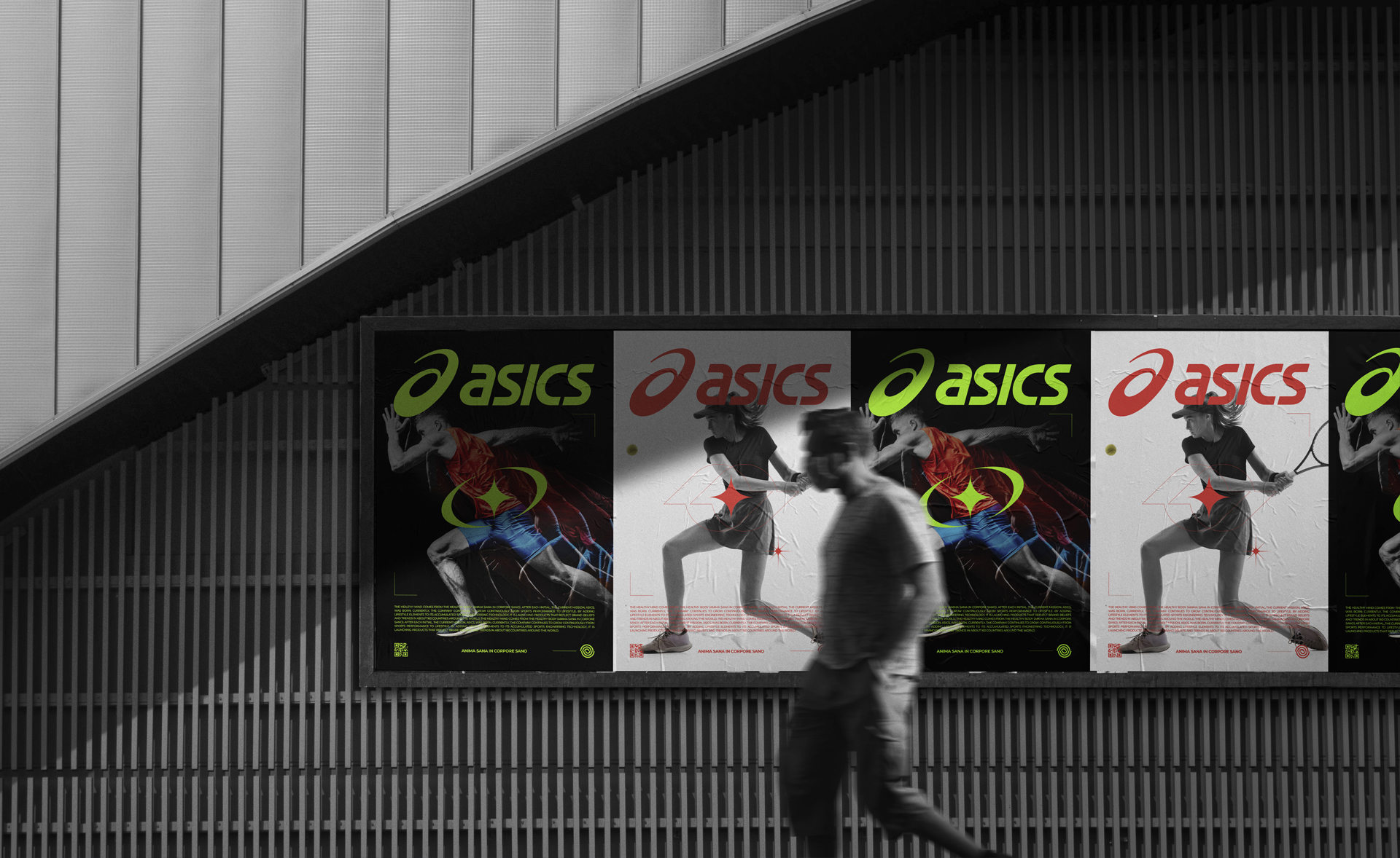 컨셉은 '역동적인 아름다움'으로, 아식스가 추구하는 스포츠 정신과 브랜드 이미지를 시각적으로 표현하는 데 중점을 두었습니다. 주요 타겟 고객은 스포츠를 즐기는 젊은층과 아식스 브랜드에 관심 있는 모든 소비자입니다. 다양한 디자인 시안을 통해 아식스의 다채로운 면모를 보여주고자 노력했어요. 간판, 인쇄물, 포스터 등 다양한 매체에 적용 가능하도록 디자인을 구성하여 실용성을 높였습니다.