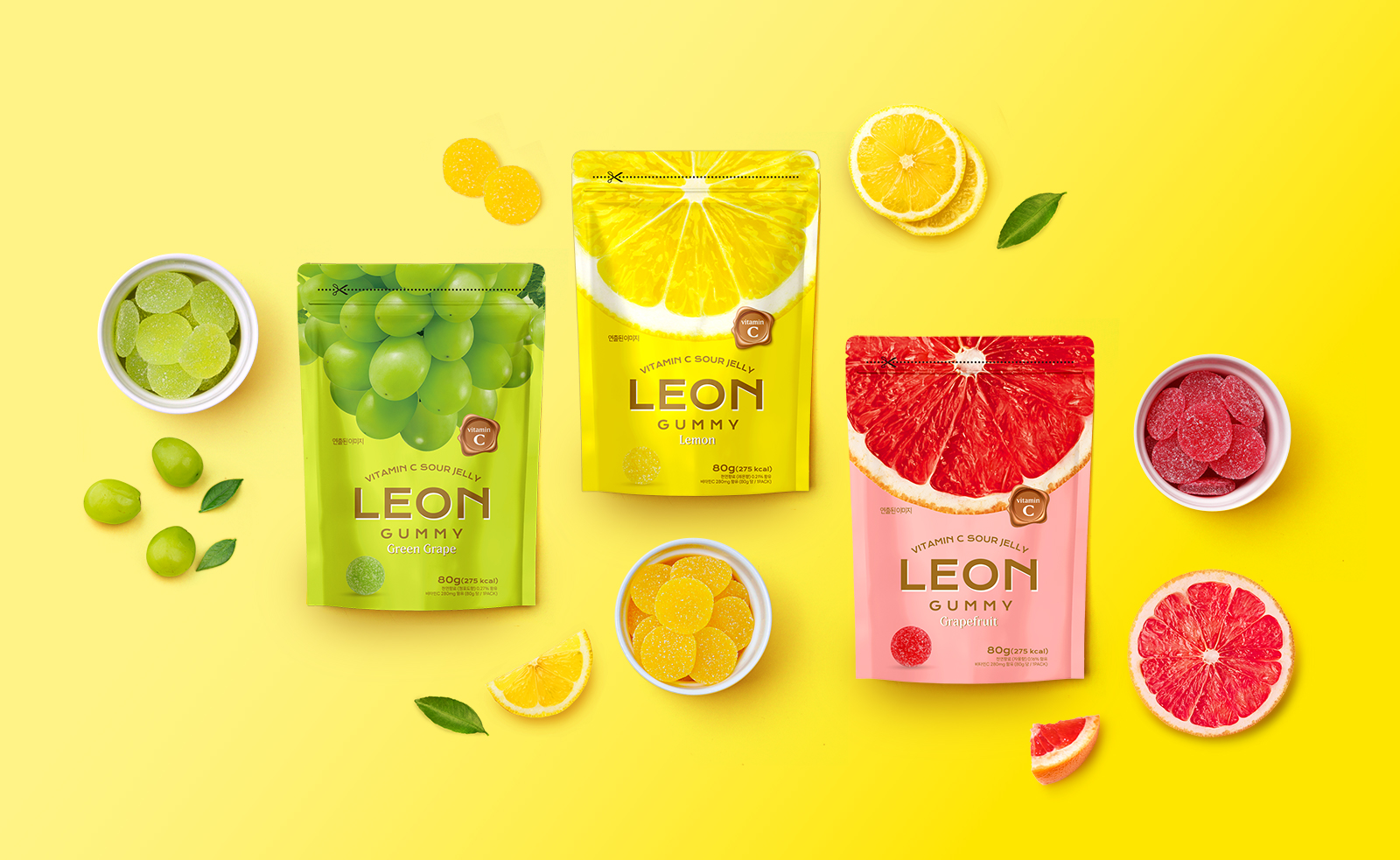 안녕하세요! 아임웹 전문가 아뮤즈웍스입니다. 이번에 소개할 작업물은 레옹 비타민C 사우어 젤리의 패키지 디자인이에요.