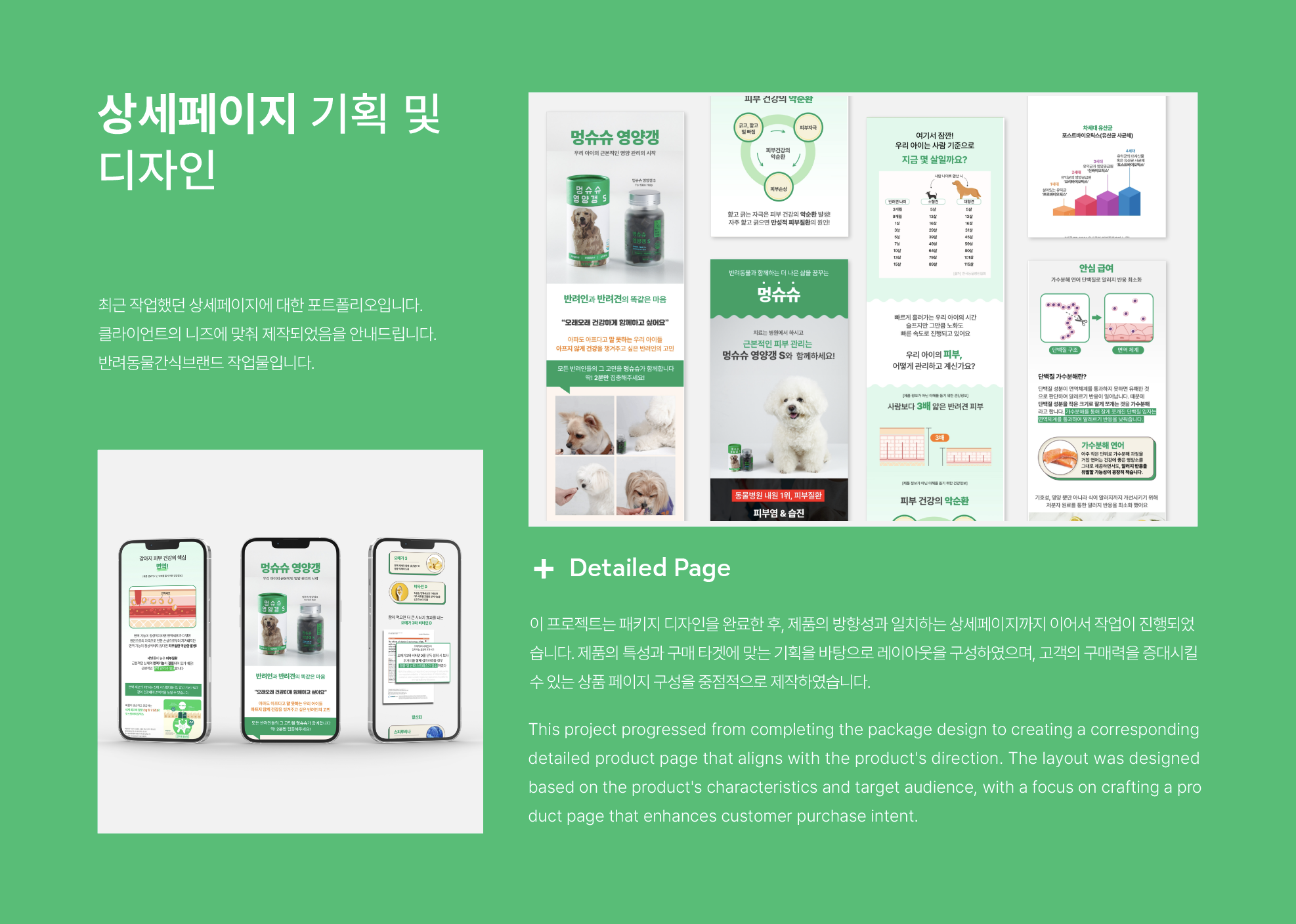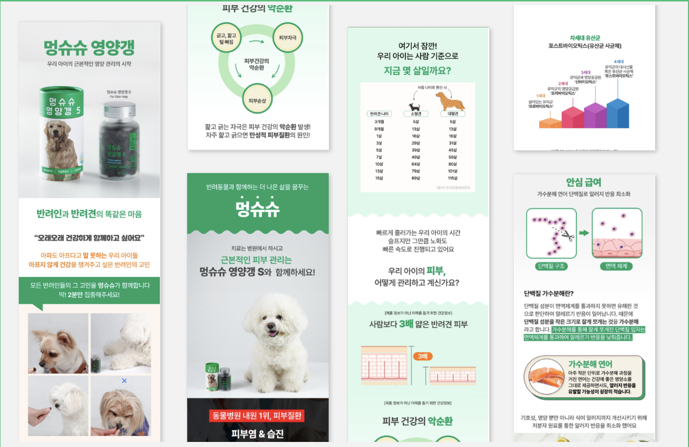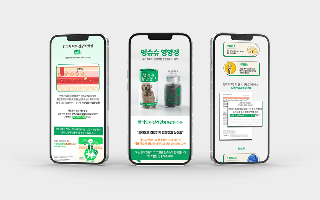 싱귤러스 디자인은 애견 간식 브랜드를 위한 상세페이지 디자인을 제작했습니다. 단순히 제품을 보여주는 것을 넘어, 브랜드 스토리와 제품의 특징을 효과적으로 전달하여 판매로 연결될 수 있도록 디자인에 중점을 두었어요. 고객의 구매 욕구를 자극하는 시각적 요소와 제품에 대한 정보를 명확하게 전달하는 정보 디자인을 적절히 균형있게 배치하여, 사용자 경험(UX)을 극대화했어요.