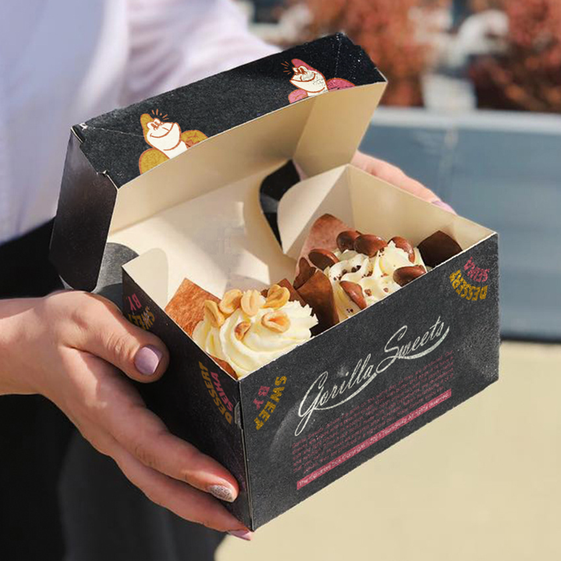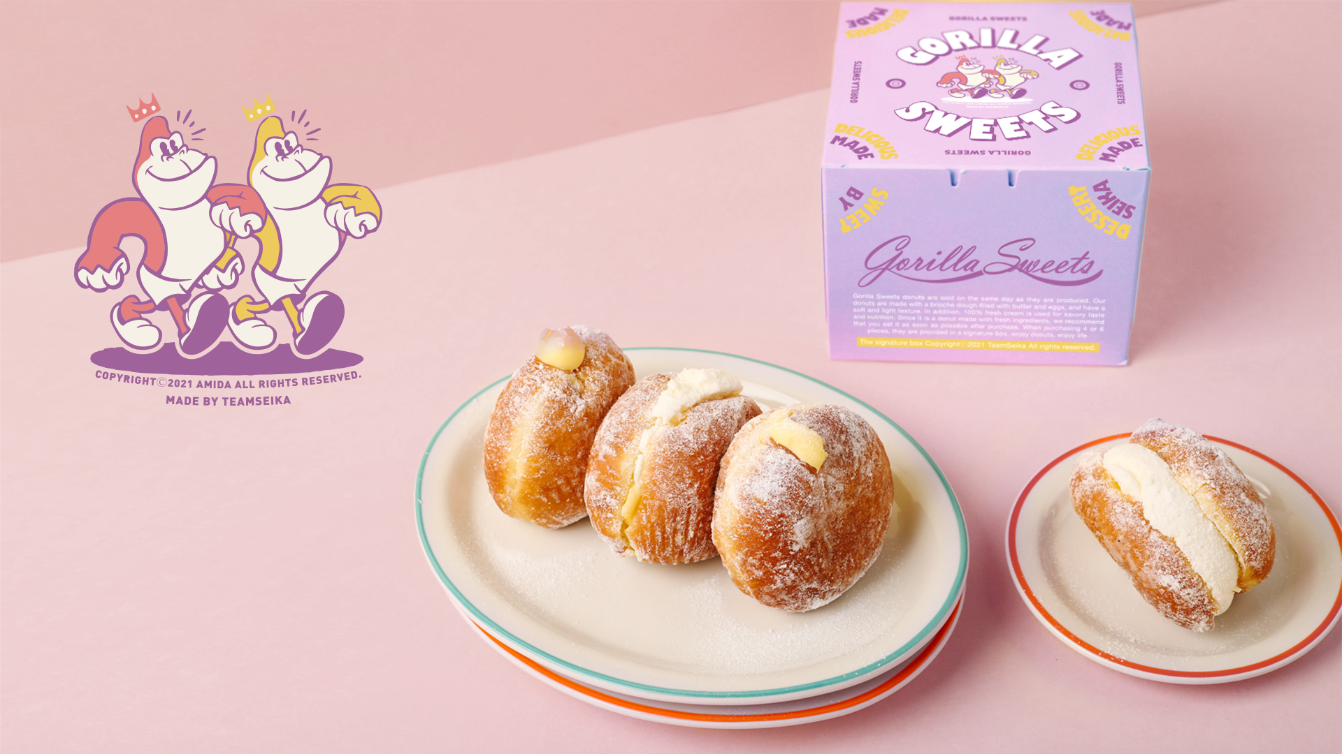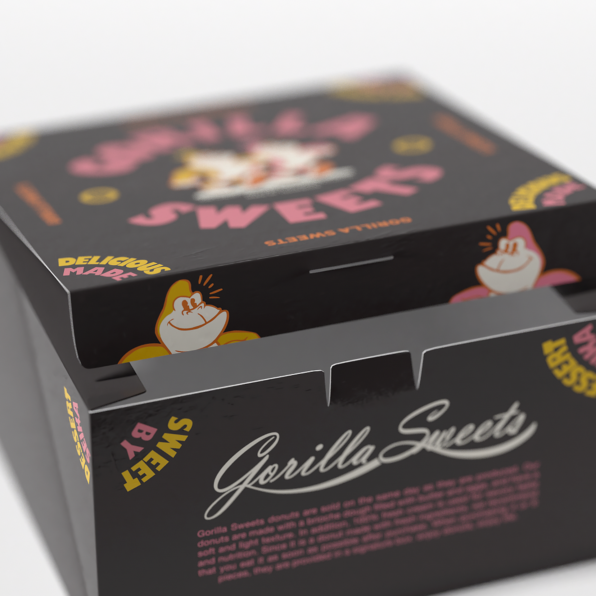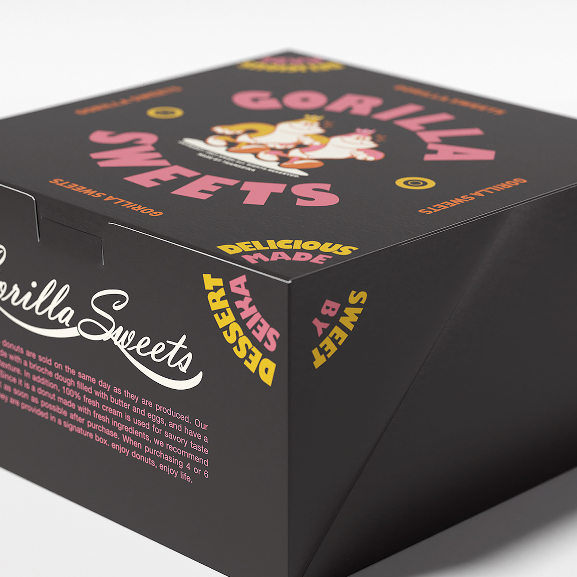 귀엽고 트렌디한 고릴라 캐릭터를 활용한 고릴라스위츠 도넛 패키지 디자인을 소개합니다. 이 디자인은 젊은 세대를 타겟으로 하여 브랜드의 친근함과 개성을 강조하는 데 중점을 두었어요.