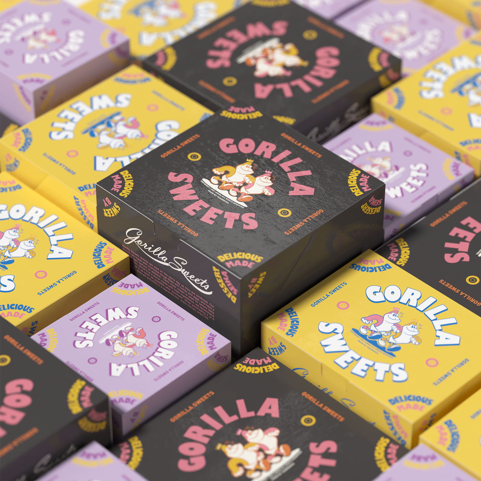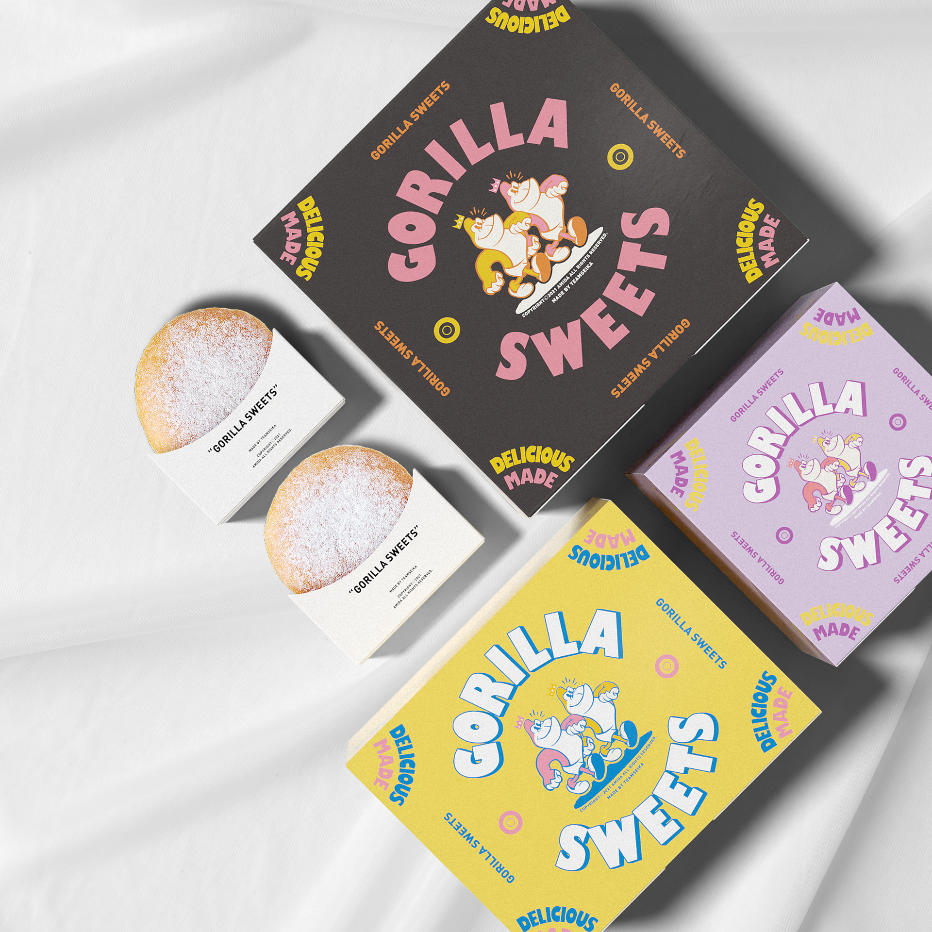 컨셉은 '귀엽고 트렌디한 고릴라가 전달하는 달콤한 즐거움'입니다. 젊은층이 좋아하는 복고풍 디자인 트렌드를 반영하여 레트로한 느낌과 고릴라 캐릭터의 유쾌함을 결합했어요. 다양한 색상의 박스 디자인을 통해 제품의 다양성과 풍성함을 보여주고, 고릴라 캐릭터는 브랜드의 아이덴티티를 확고히 하는 역할을 합니다.