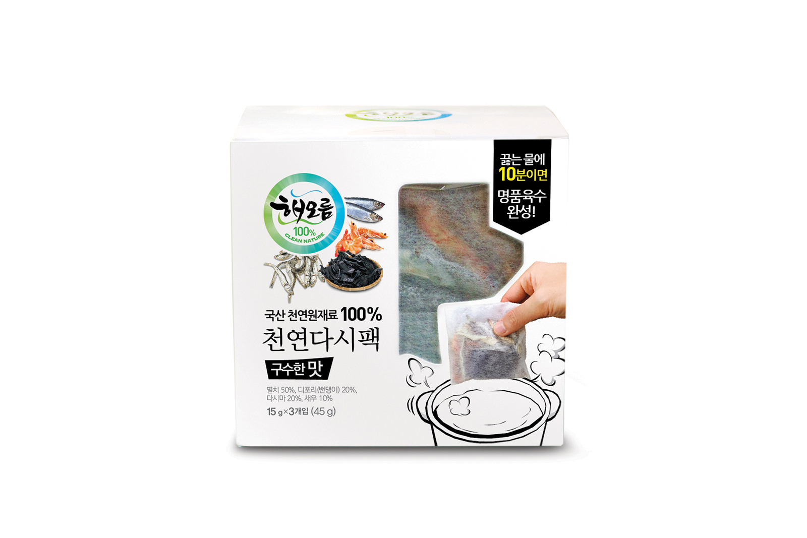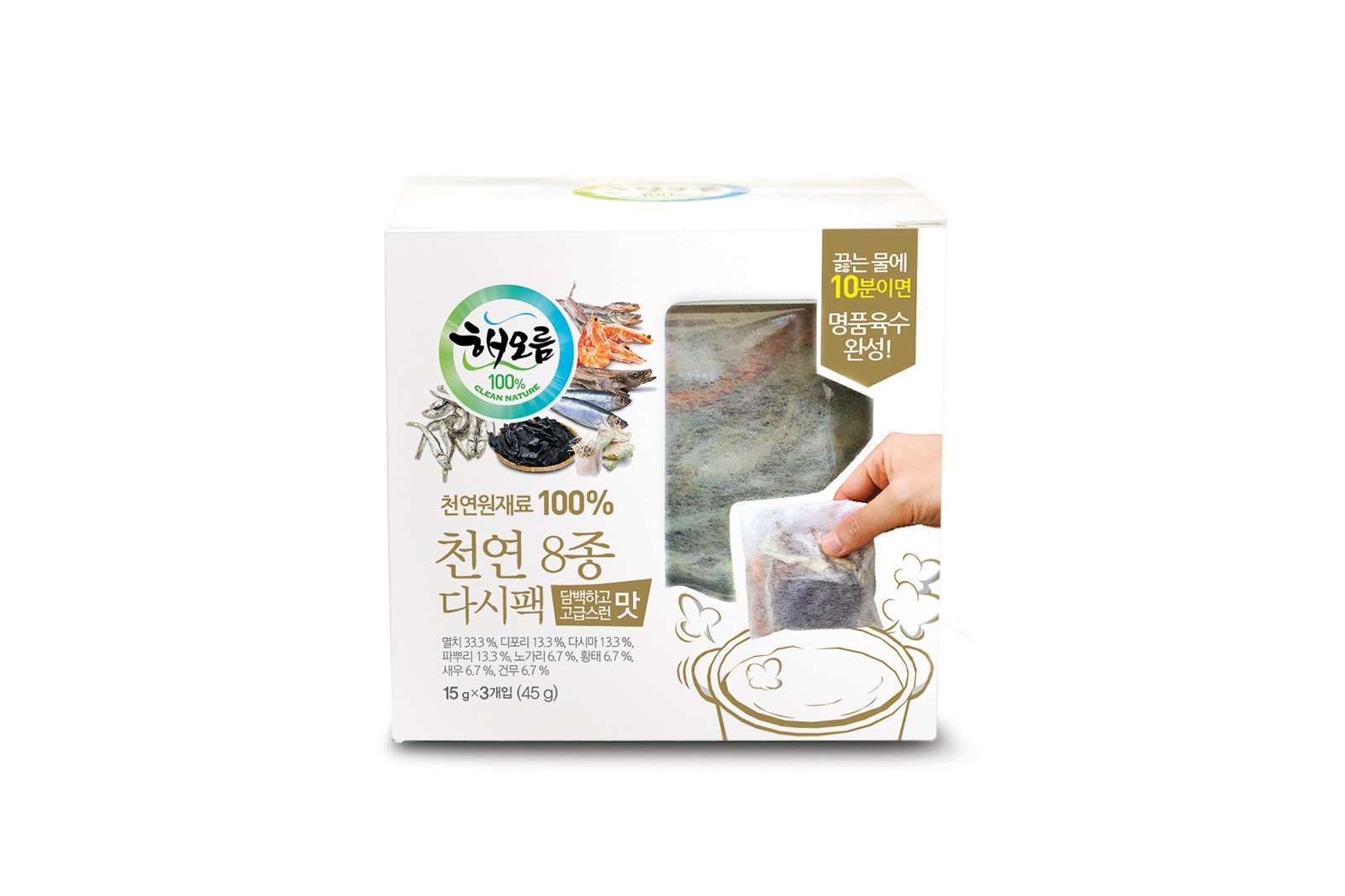 크크디자인에서 제작한 해오름 천연 다시팩 패키지 디자인은 국내산 천연 재료를 사용한 제품의 특징을 잘 나타내도록 제작되었어요. 깔끔하고 심플한 디자인으로 고급스러움을 더했고, 제품의 신선함과 자연스러움을 강조하는 디자인 컨셉을 가지고 있어요. 젊은층부터 중장년층까지 폭넓은 고객층을 타겟으로, 건강을 중시하는 소비자에게 어필할 수 있도록 디자인을 구성했죠.
