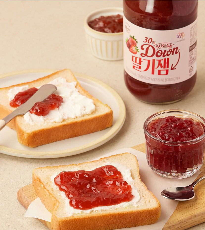 컨셉은 '건강하고 맛있는 딸기잼'을 표현하는 것이었어요. 젊은 층을 타겟으로 깔끔하면서도 귀엽고, 건강함을 나타내는 디자인을 목표로 했죠. 딸기잼의 맛있는 비주얼과 30%슈거다운이라는 제품 특징을 잘 나타내기 위해 딸기 이미지와 함께 '30% SUGAR DOWN' 문구를 강조했어요.
