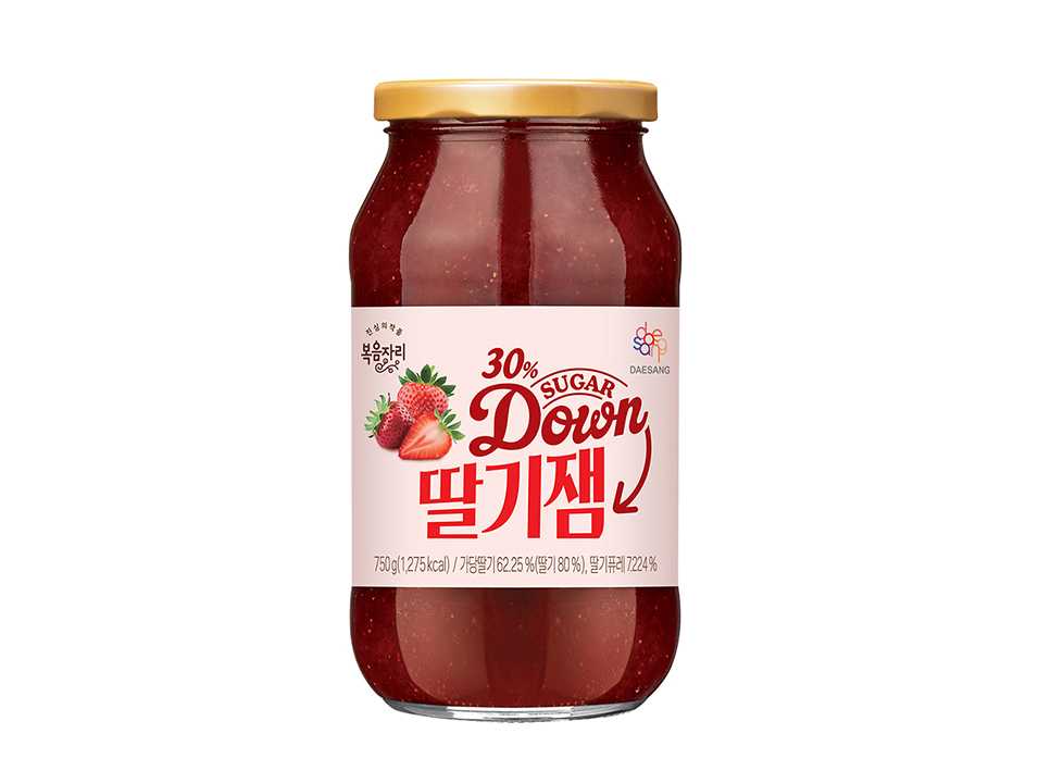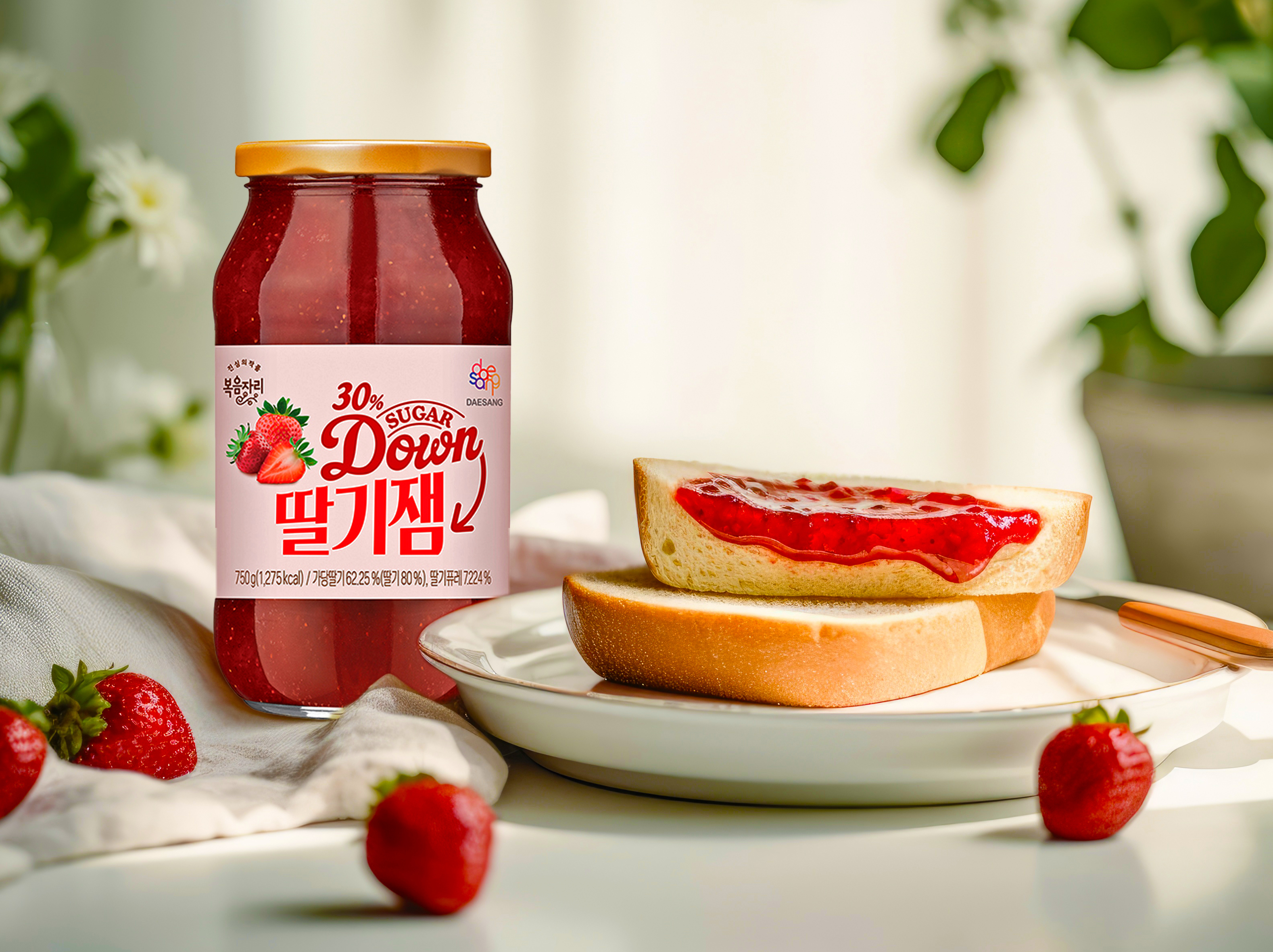 이 디자인은 젊은 소비자들에게 건강한 맛을 추구하는 트렌드를 반영하여 제작되었어요. 기존 딸기잼과 차별화되는 30%슈거다운이라는 특징을 부각시켜 소비자들이 쉽게 제품을 선택하도록 하는 것이 목표였고, 잼 용기 디자인과도 잘 어울리는 디자인이라고 생각해요. 실제 제품 패키지에 적용되어 시중에서 판매되고 있어요.