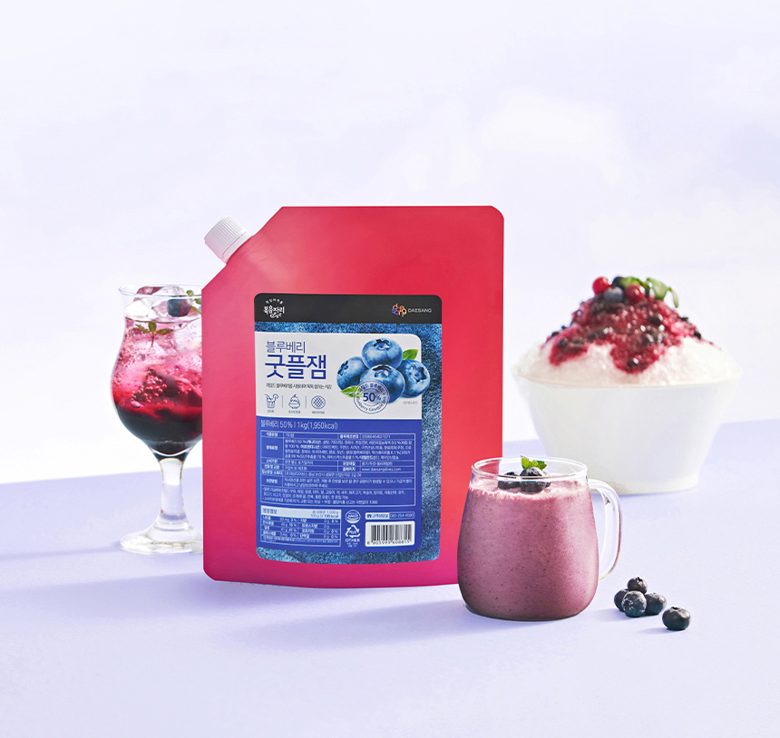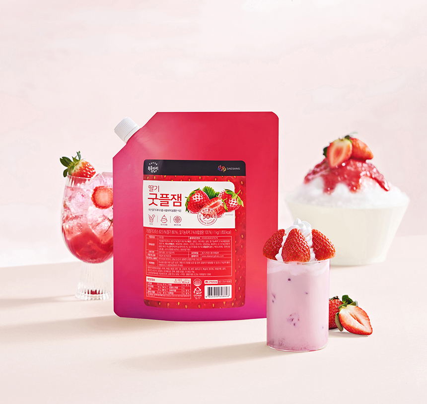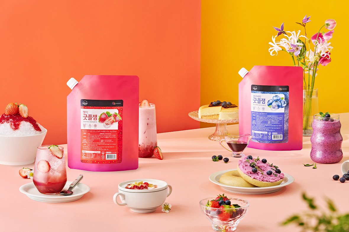 컨셉은 ‘젊고 활기찬 과즙청’이에요. 밝고 화사한 색감과 깔끔한 디자인으로 제품의 특징을 시각적으로 잘 나타내고자 했어요. 특히, 제품 패키지 디자인은 과일의 생생함과 청량감을 느낄 수 있도록 신경 썼답니다. 딸기, 블루베리 과즙청의 특징을 살려 각각의 이미지를 효과적으로 전달하고 있어요. 사진 속에 보이는 빙수, 스무디, 음료 등 다양한 활용 예시를 통해 제품의 다양성을 보여주고, 소비자의 구매 욕구를 자극하는 데 집중했어요.