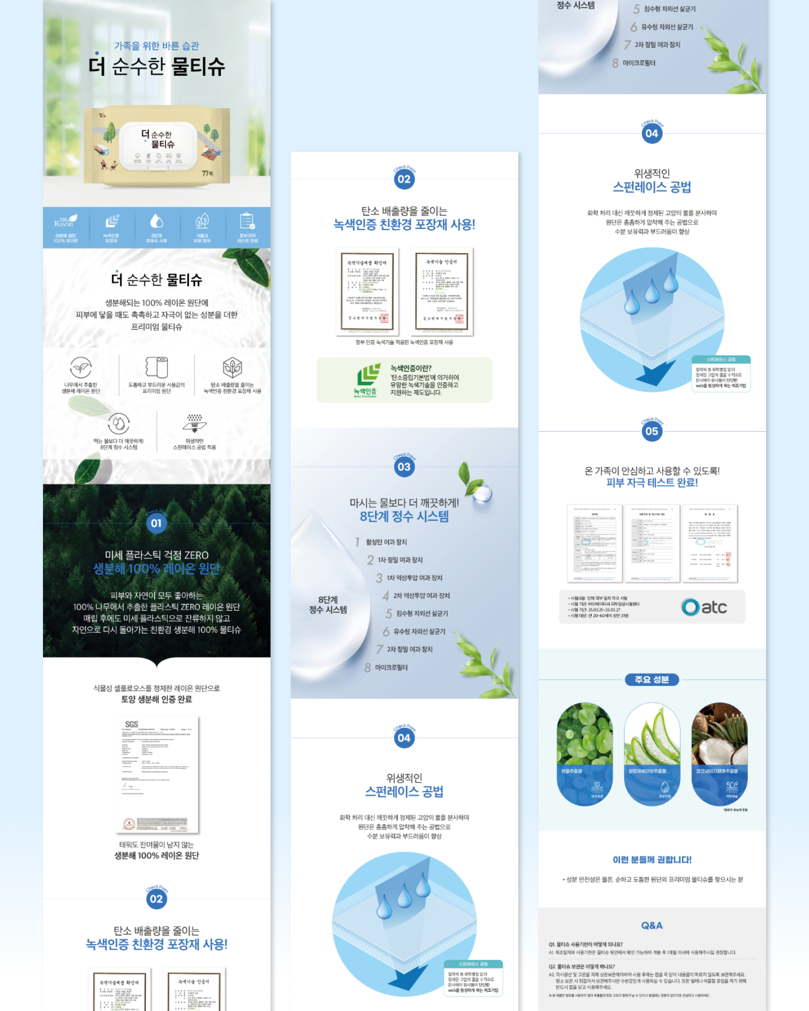 안녕하세요! 아임웹 전문가 jela1004입니다. 물티슈 상세페이지 디자인이에요. 깔끔하고 직관적인 디자인을 통해 제품의 특징과 장점을 효과적으로 보여주는 것을 목표로 했어요.