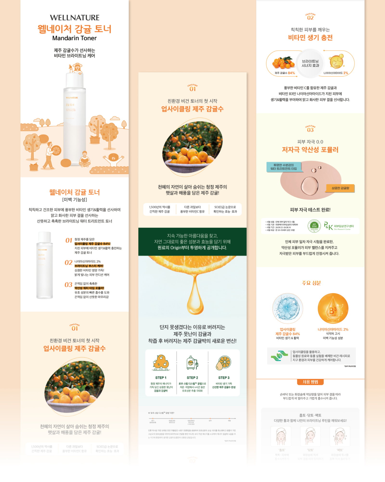 웰네이처 감귤 토너 상세페이지 제작 컨셉은 '자연의 신선함과 제품의 효능을 시각적으로 매력적으로 전달'하는 것이에요. 젊은 여성층을 타겟으로, 감각적이고 세련된 디자인을 통해 제품에 대한 긍정적 인식을 심어주고자 했어요.