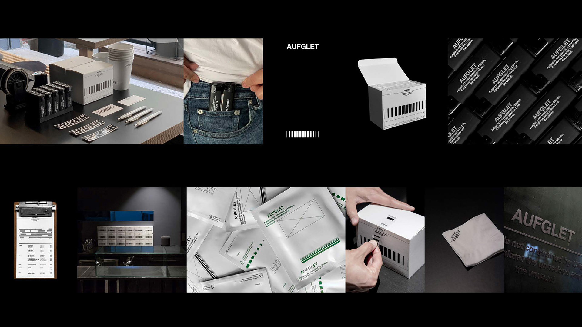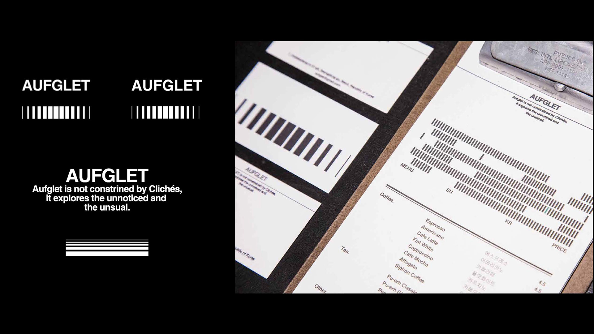 AUFGLET은 서울시에 위치한 카페 겸 갤러리로, Refine(정제됨)과 Masculine(남성적인)을 주요 컨셉으로 한 브랜딩 작업이 진행되었습니다. 간결한 기하학적 도형과 흑백의 미니멀한 색조를 활용하여, 세련되고 강렬한 브랜드 이미지를 구축하는 데 초점을 맞췄습니다.