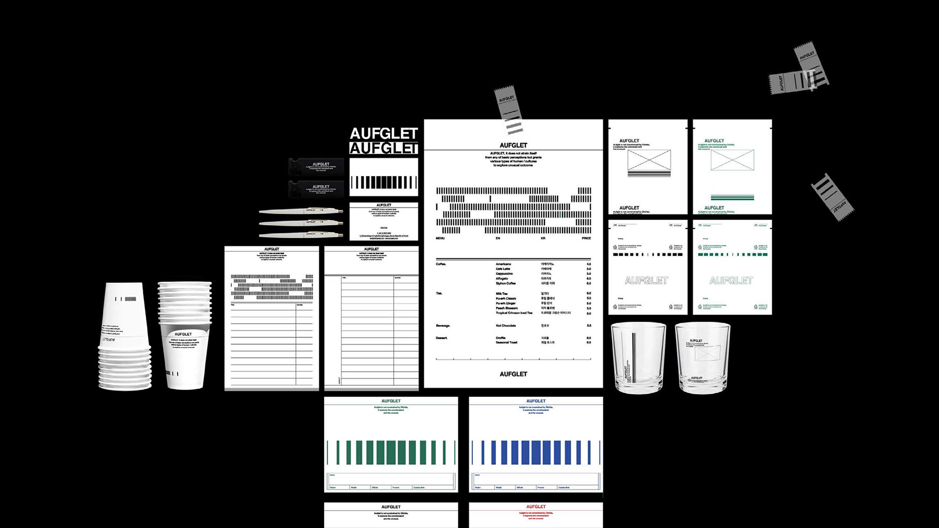 브랜딩은 카페 운영에 필요한 다양한 오브젝트를 통해 구현되었습니다. 컵, 메뉴판, 간판, 굿즈 등 실제로 공간에서 사용되는 요소들에 통일된 디자인 언어를 적용하여 브랜드의 정체성을 더욱 구체화했습니다. 특히 간판은 **aufglet**의 심볼로 사용된 스트라이프를 다각도로 재해석해, 한국식 족자 형태로 디자인함으로써 독창적이고 매력적인 시각적 경험을 제공했습니다.