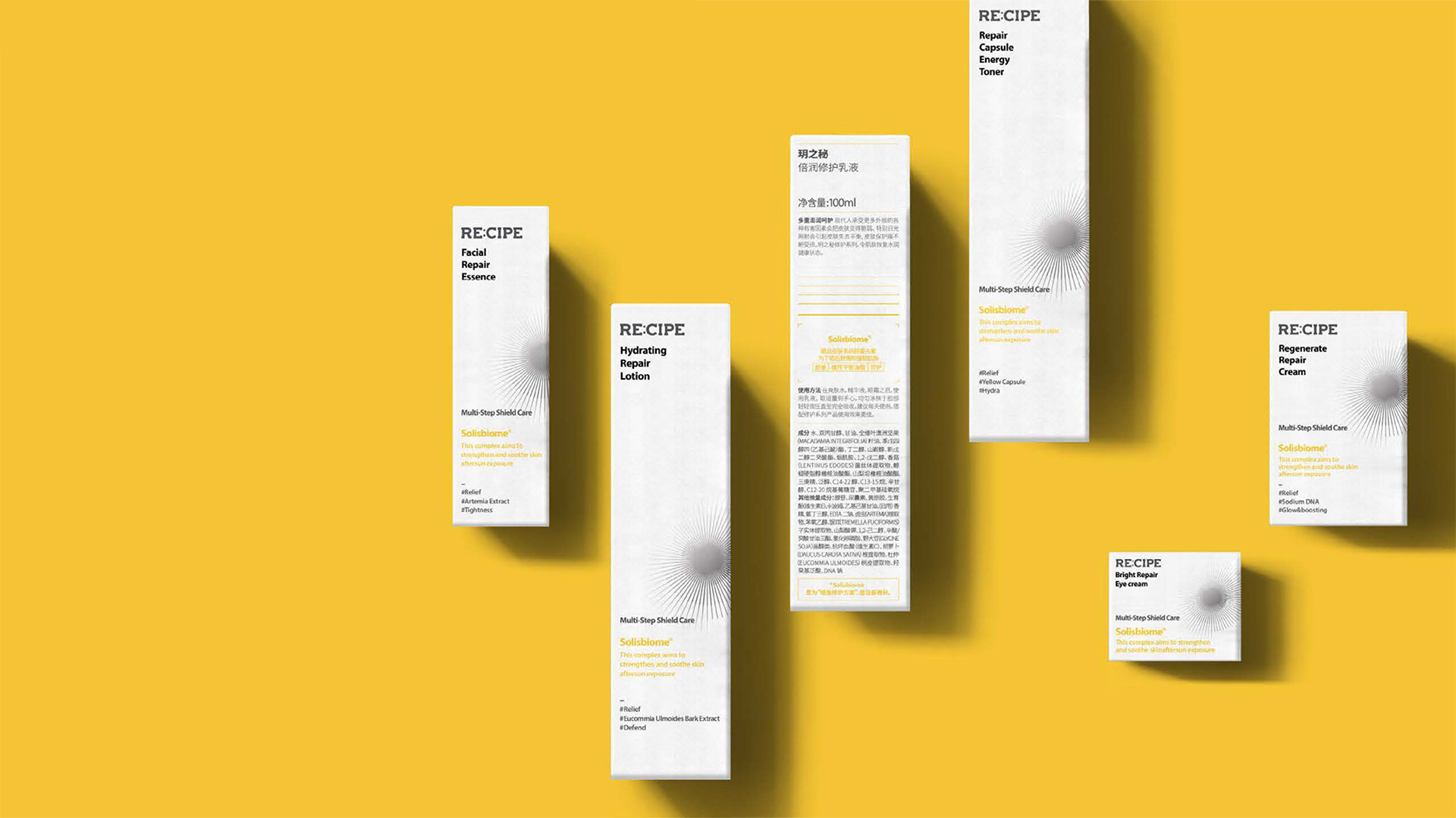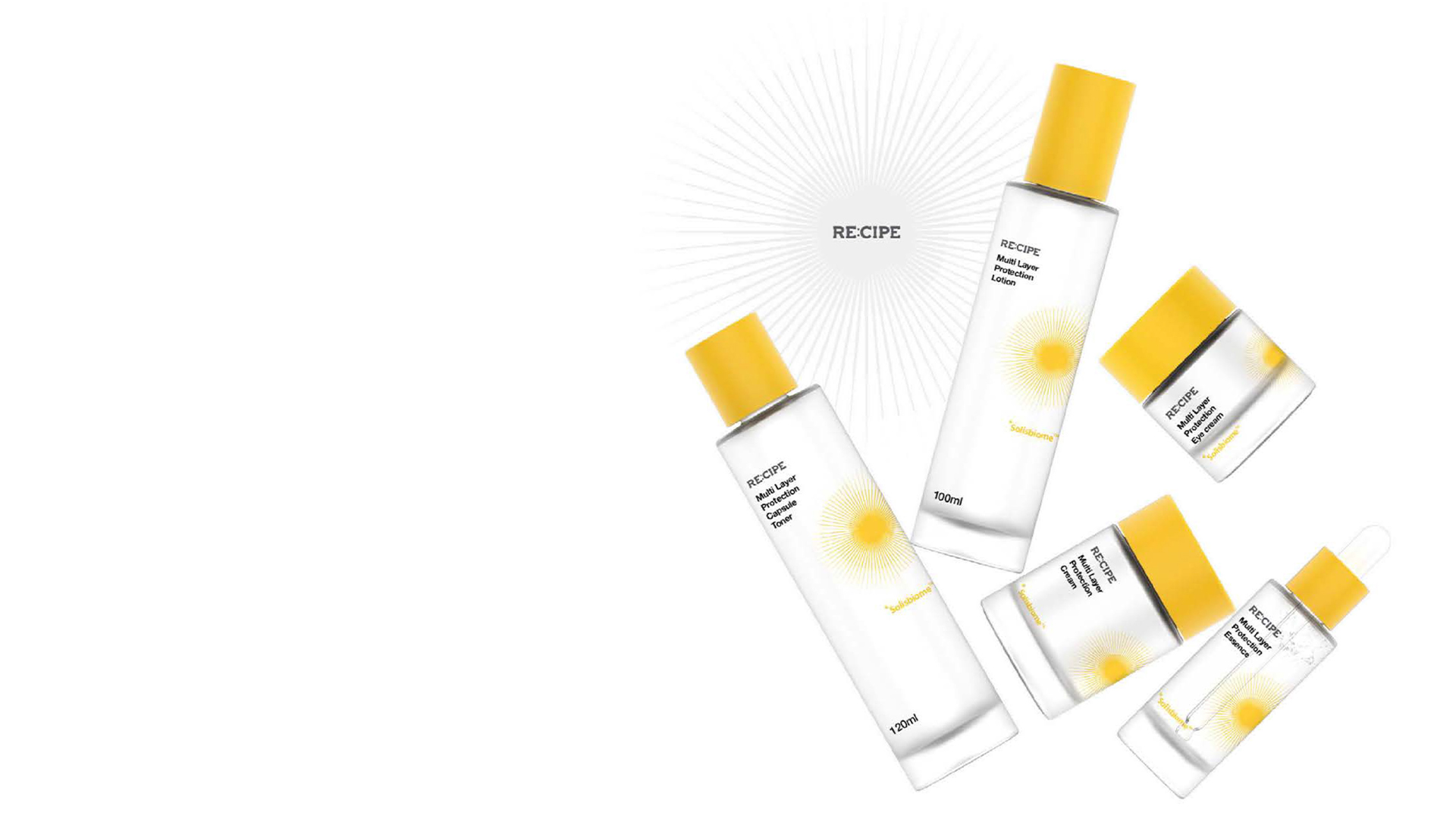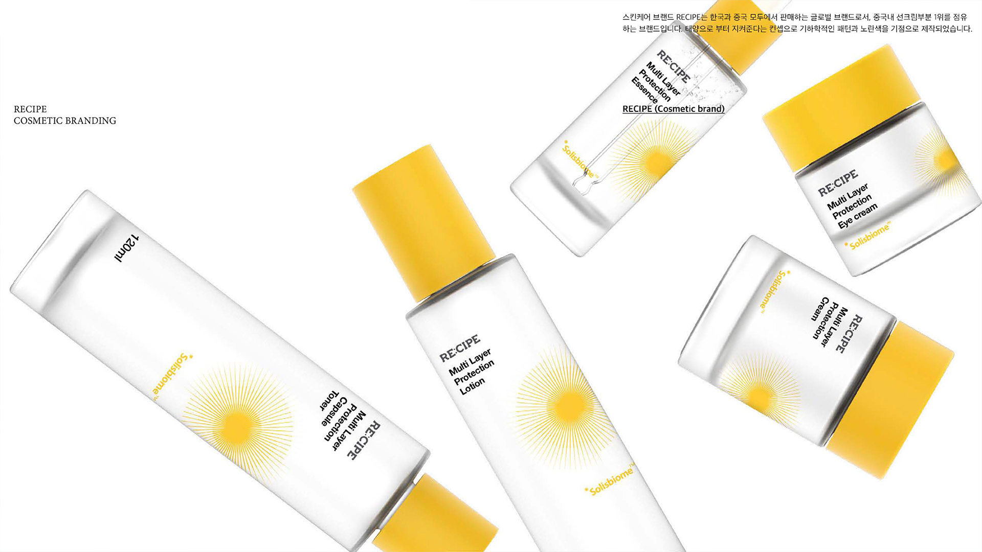 브랜드는 태양으로부터 피부를 지켜준다**는 콘셉트를 중심으로 설계되었으며, 이를 시각적으로 표현하기 위해 기하학적인 패턴과 노란색을 주요 디자인 요소로 활용했습니다. 이러한 브랜딩은 RECIPE의 제품이 제공하는 보호 기능과 밝고 긍정적인 이미지를 효과적으로 전달하며, 소비자들에게 브랜드의 정체성을 명확히 인식시킵니다.
