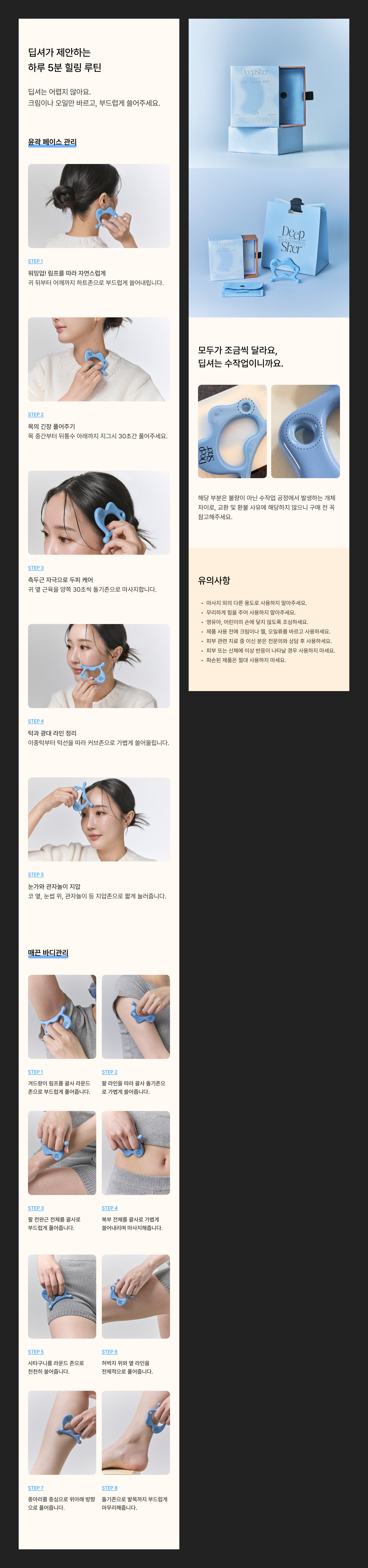 안녕하세요, 아임웹 전문가 도도웹입니다. 이번에 소개해 드릴 포트폴리오는 딥셔 괄사의 상세페이지 제작 사례입니다. 딥셔 괄사는 얼굴 라인 관리에 도움을 주는 제품으로, 저희는 제품의 특징을 효과적으로 보여주는 상세페이지를 목표로 디자인했습니다.