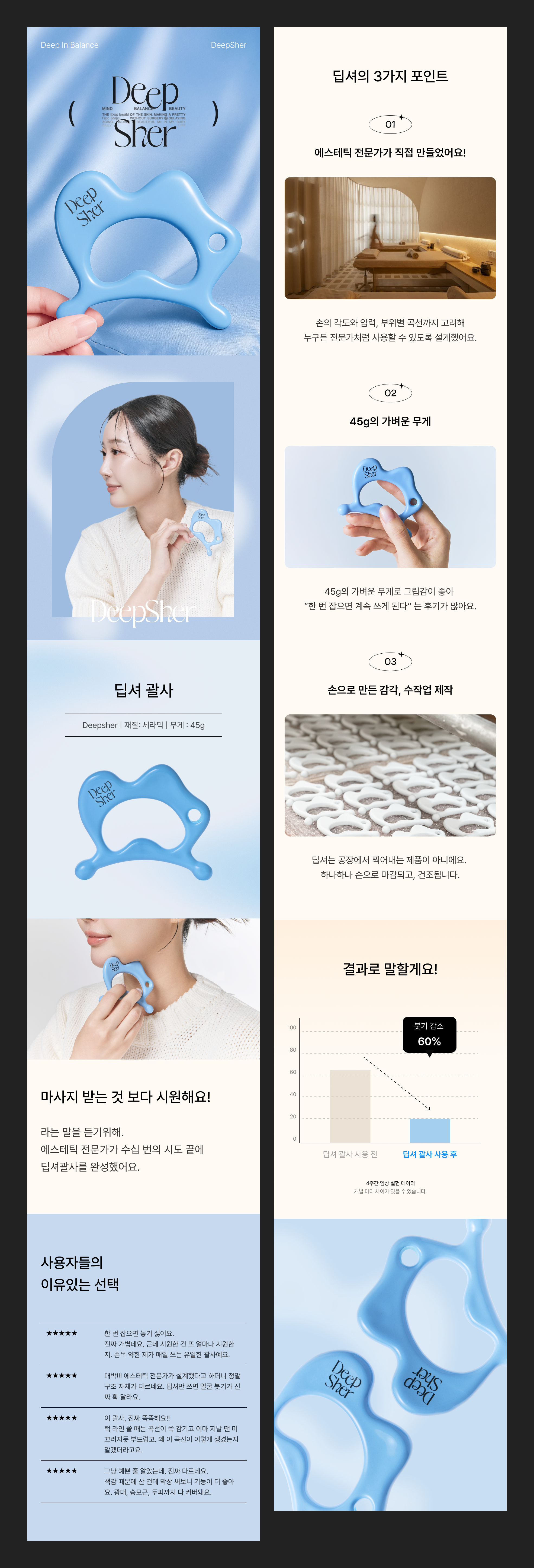컨셉은 '고급스러움과 신뢰감'입니다. 딥셔 괄사의 고급스러운 이미지를 유지하면서, 제품 사용법을 직관적으로 보여주는 것을 중요하게 생각했어요. 피부 관리에 관심있는 20대 후반~40대 여성 고객들을 타겟으로 잡고, 제품의 효과와 사용 편의성을 강조하여 신뢰감을 높이고자 했습니다.