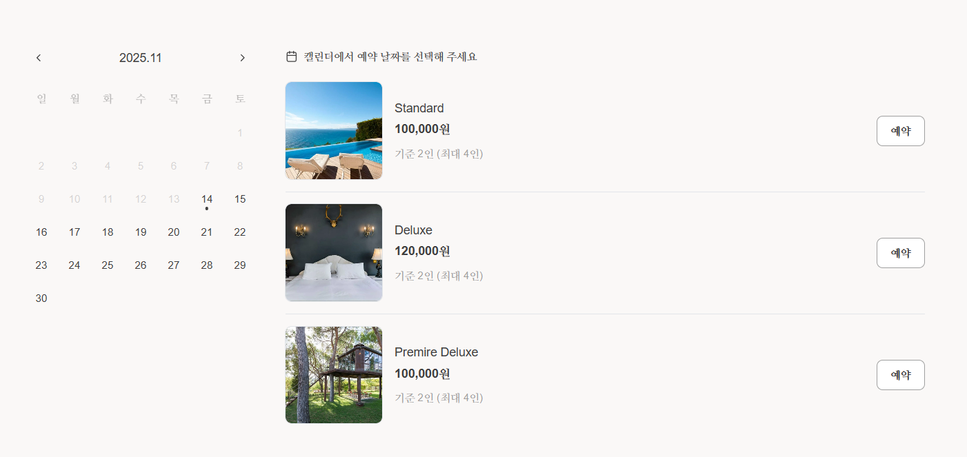 예약 상품을 방문자가 클릭해 보고 예약할 수 있도록 페이지에 진열합니다. 예약 상품은 달력 형식으로 표시되며, 방문자는 원하는 날짜의 예약 가능한 상품을 클릭해 상세 예약 과정을 진행할 수 있습니다.