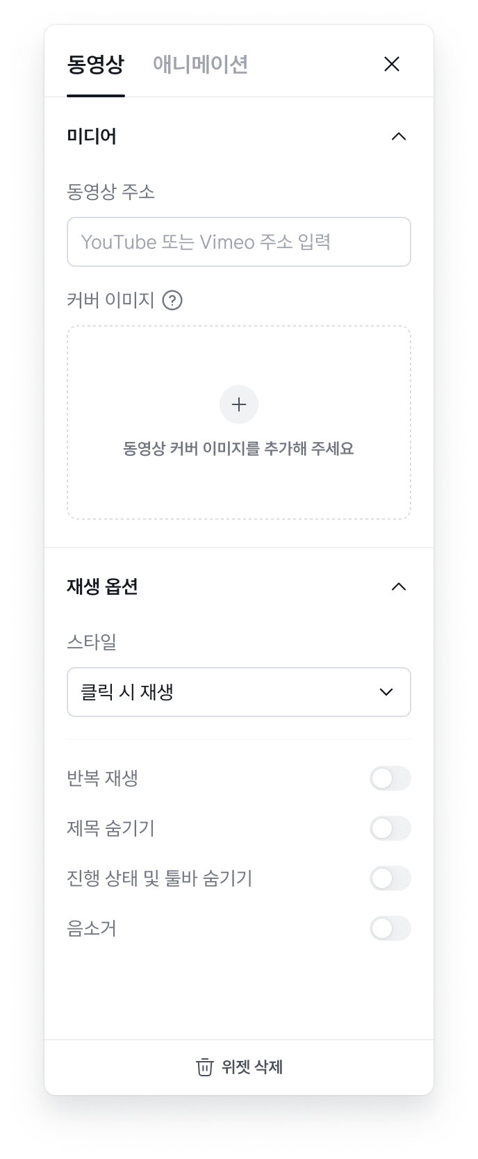 동영상 위젯 설정을 변경해 동영상을 연결하고 다양한 옵션을 추가할 수 있습니다.