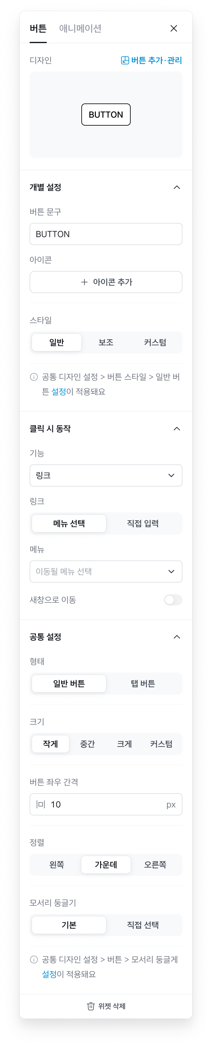 - 공통 설정: 버튼이 여러 개일 경우, 모든 버튼에 동일하게 적용되는 설정입니다.