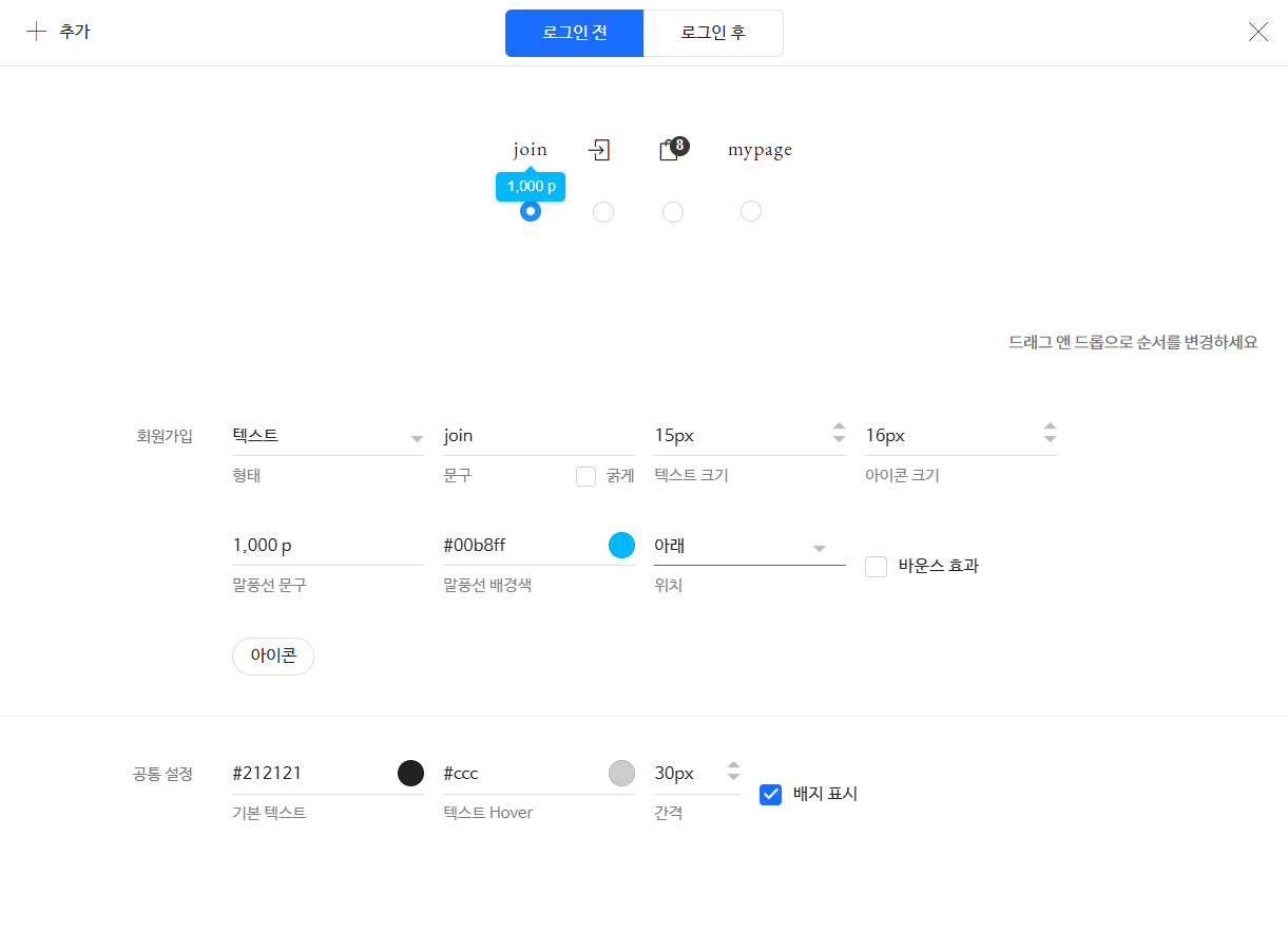 공통 설정을 변경하면 추가한 모든 링크/버튼의 설정(텍스트 색상, 객체간 간격, 배지 표시)이 로그인 전, 로그인 후에 관계없이 모두 변경되니 유의하시길 바랍니다.