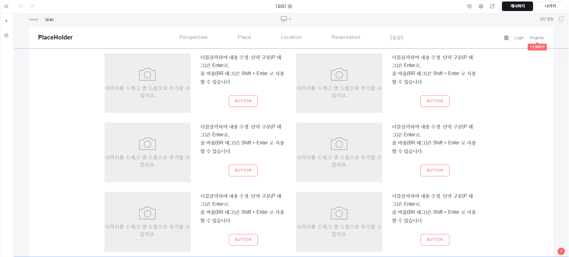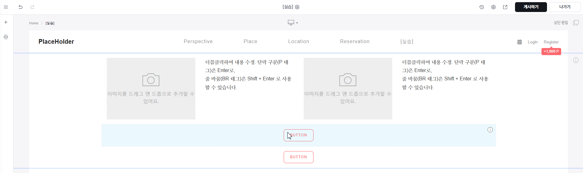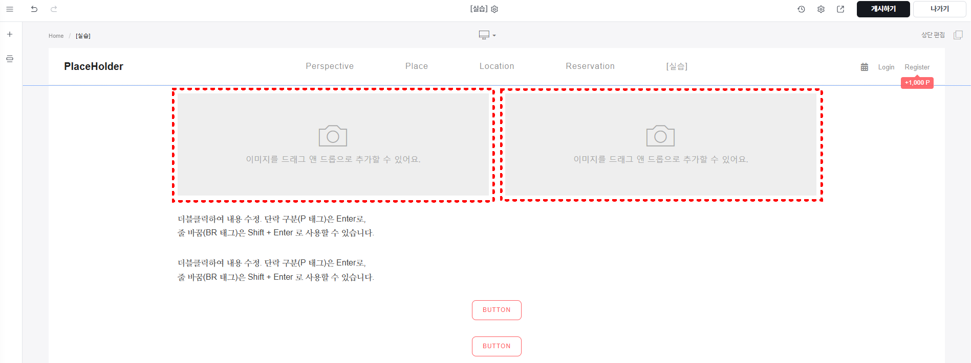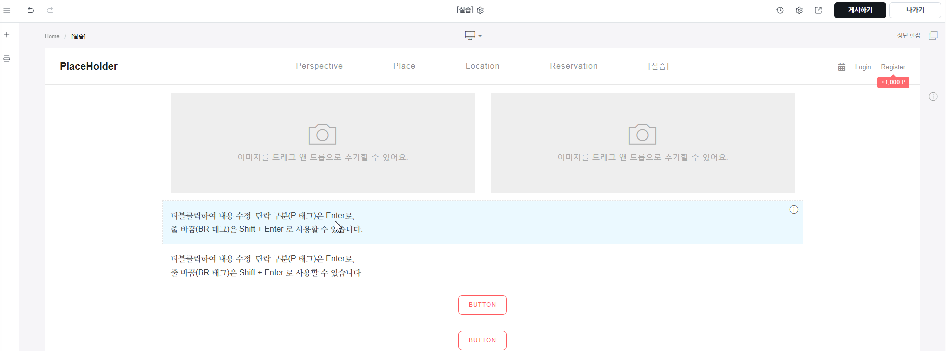- 텍스트 위젯을 더블-클릭해 글자를 작성하고, 이미지 및 버튼 설정을 열어 내용을 추가합니다. 위젯 설정하기