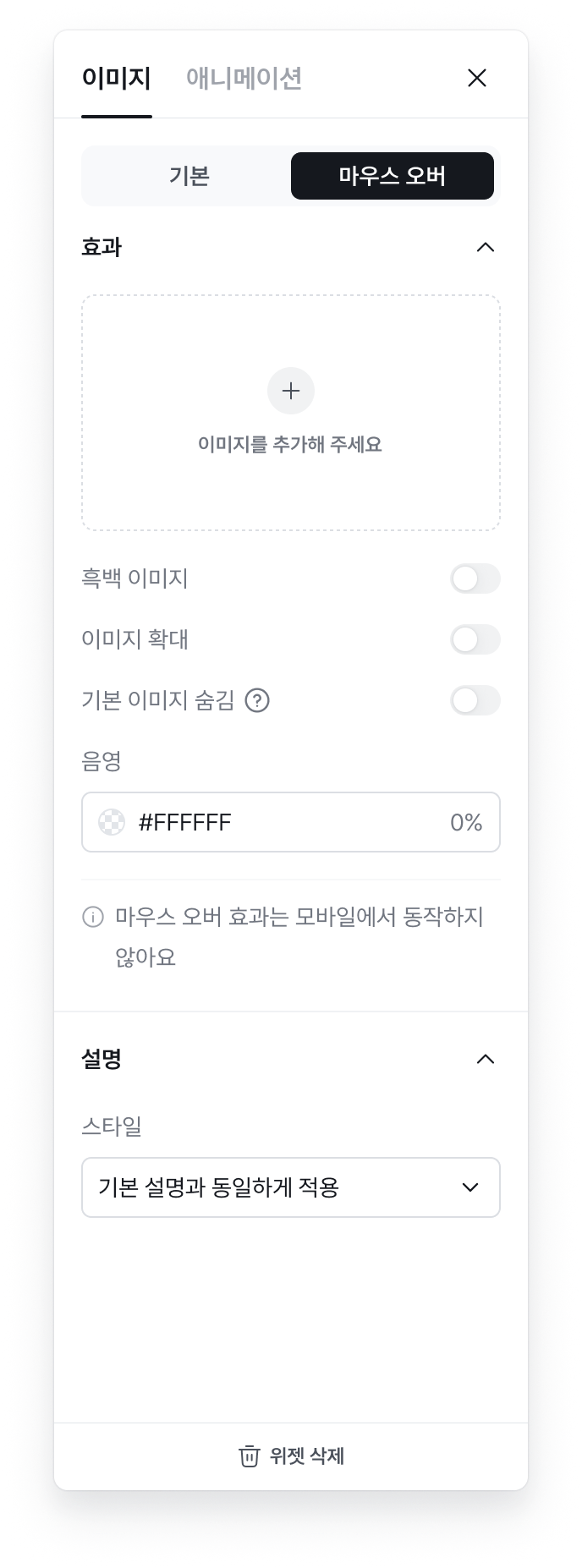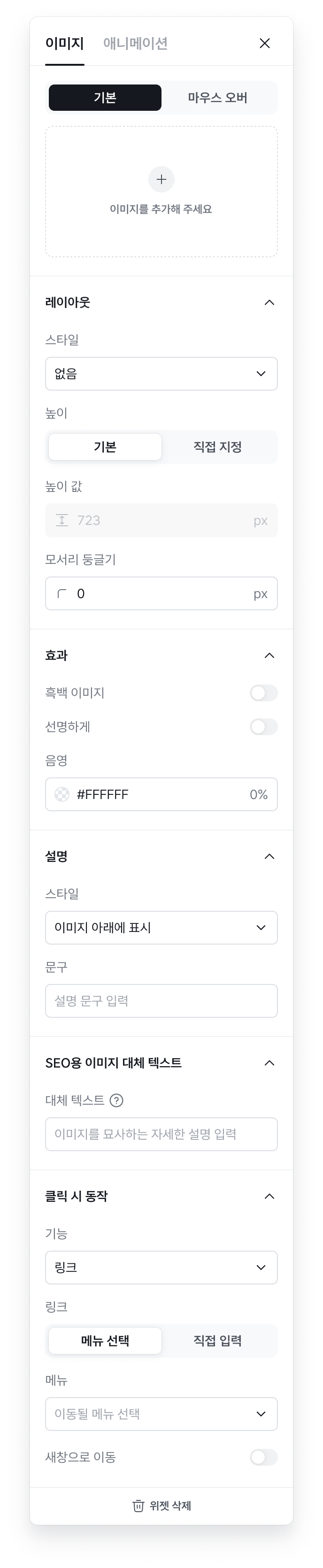 이미지 위젯은 아래의 그림처럼 두 가지 이미지를 추가할 수 있도록, 이미지 설정 항목이 기본 이미지 와 마우스오버 이미지 항목이 나눠져 있습니다. 사용자는 기본 이미지에 기본으로 표시될 이미지를 추가하고, 마우스오버 이미지엔 마우스 포인터를 올렸을 때 전환될 이미지를 추가할 수 있습니다.