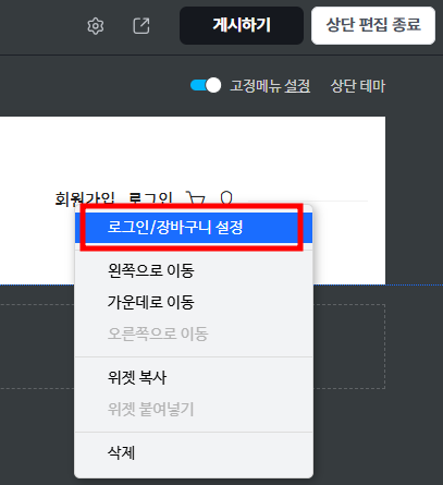 - 상단 디자인 모드에서 로그인/장바구니 위젯을 추가합니다. 상단 위젯 추가방법
