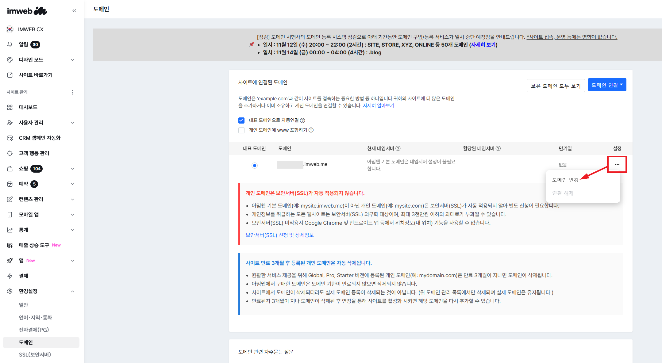 1. 사이트 [관리자 페이지 > 환경설정 > 도메인] 으로 접속해 주세요. 이후 '수정하기' 혹은 '관리하기' 버튼을 클릭합니다.