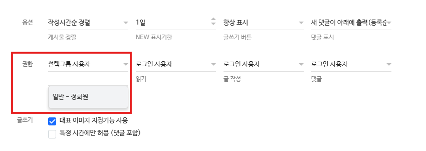 - 선택그룹 사용자 :그룹에 지정된 사용자들만 해당 게시판에 접근, 글 읽기, 글쓰기, 댓글을 읽거나 쓰기 등이 가능해요.